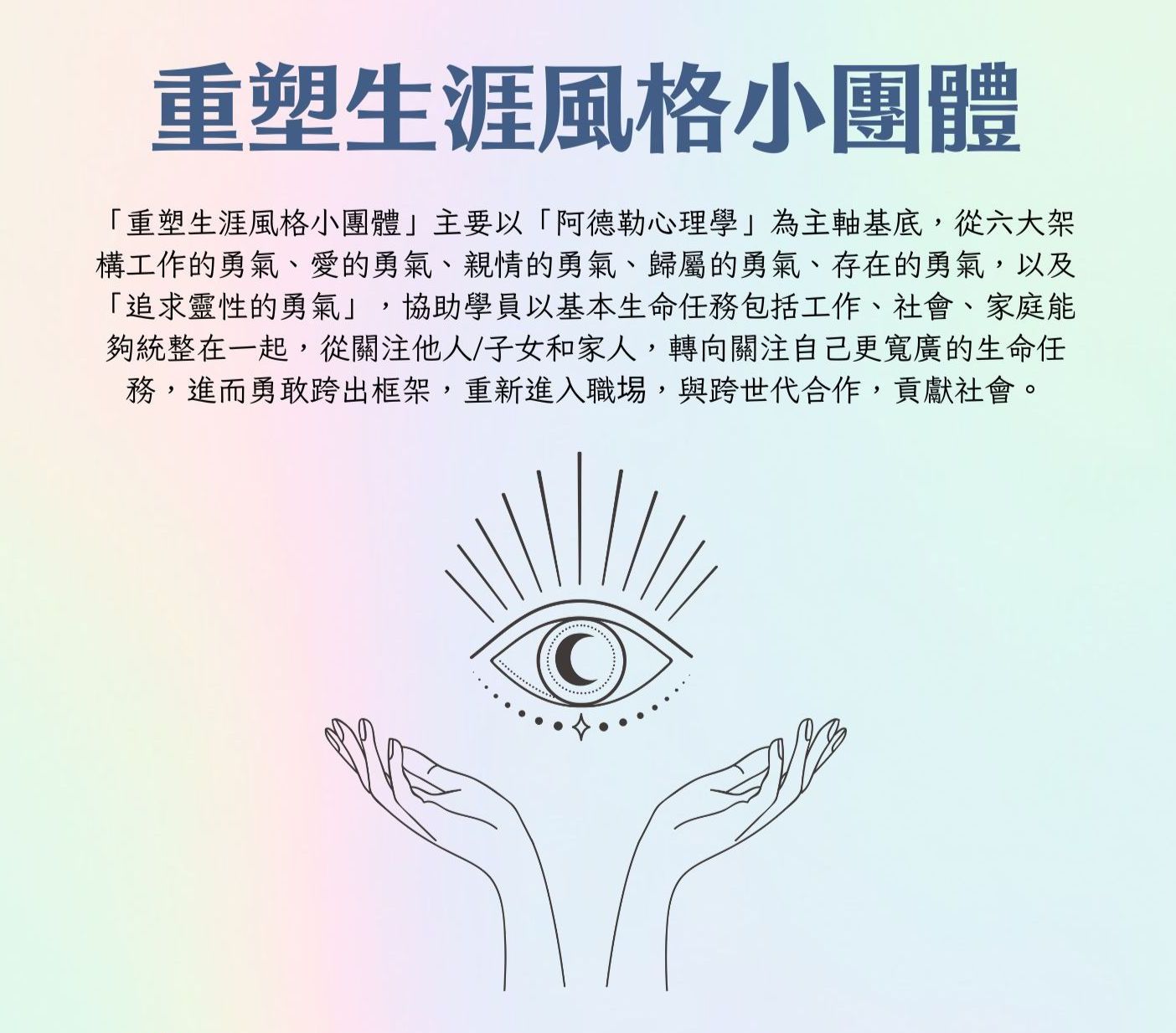我們將以「阿德勒心理學」為核心,結合六大架構,包括『工作的勇氣』、『愛的勇氣』、『親情的勇氣』、『歸屬的勇氣』、『存在的勇氣』以及『追求靈性的勇氣』,協助您統整基本生命任務,包括工作、社會和家庭,並轉向關注自己更寬廣的生命任務。透過問題引導和困境排除,將帶領您重回職場,與不同世代的人合作,並為社會做出貢獻。