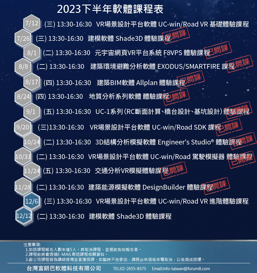 - 如您有其他希望參加的場次,請您E-mail至 info-taiwan@forum8.com,