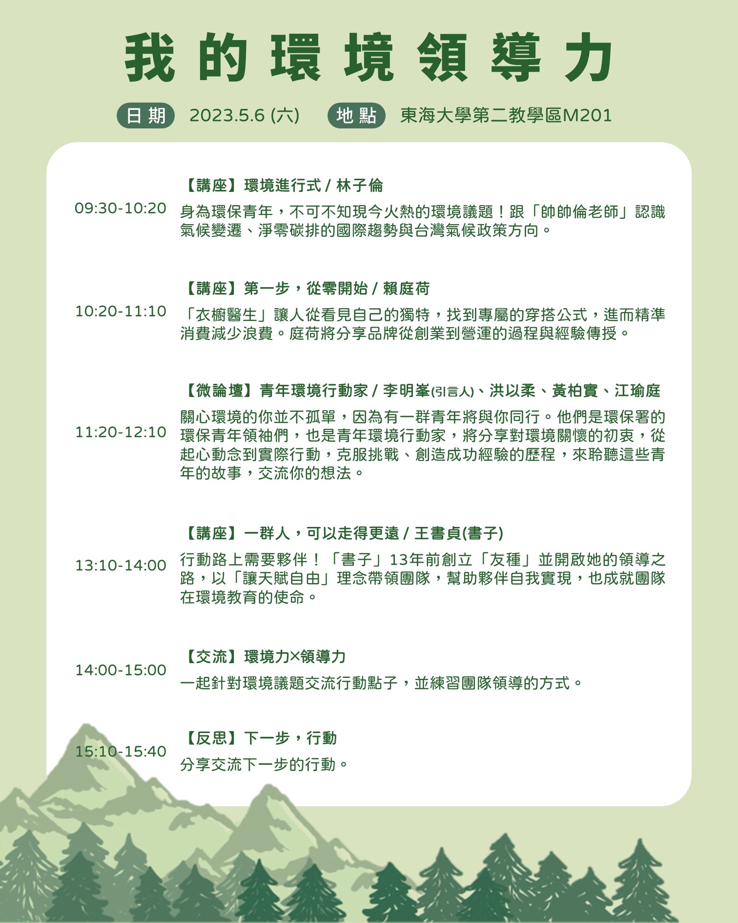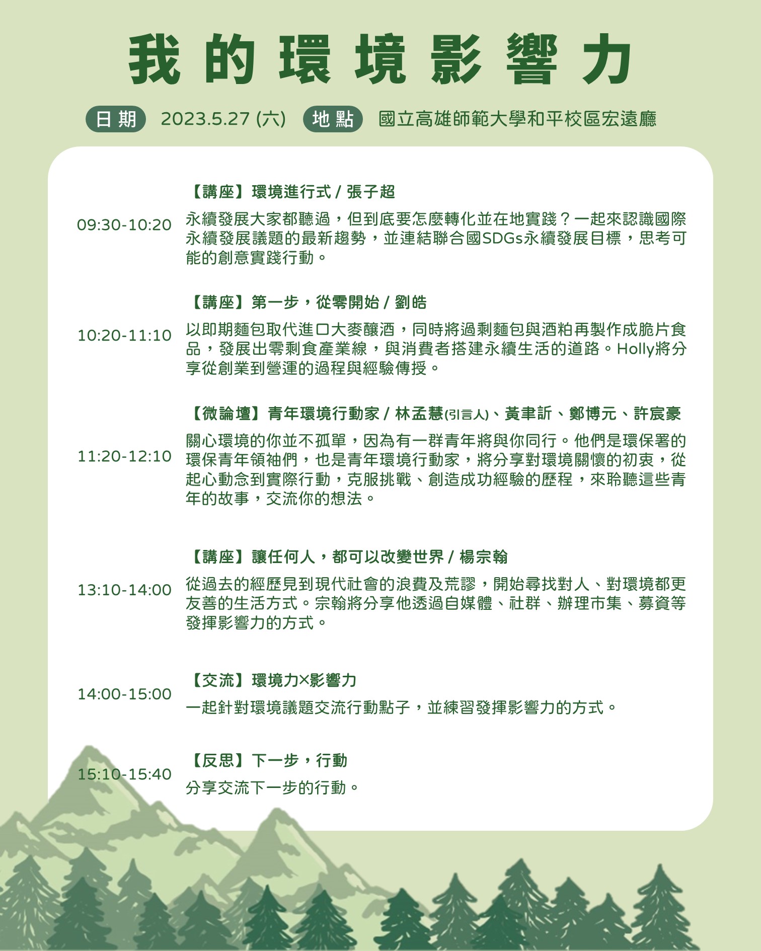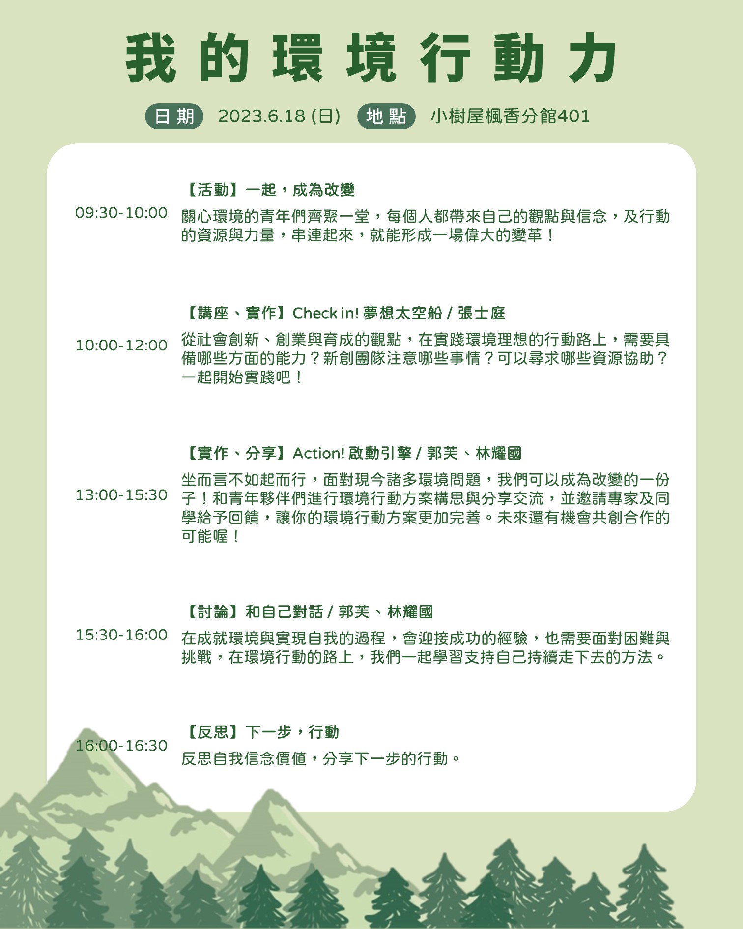 - 【第3場】:歡迎有意願參與或發起環境行動,或已經在執行環境行動方案的30歲以下青年參與。