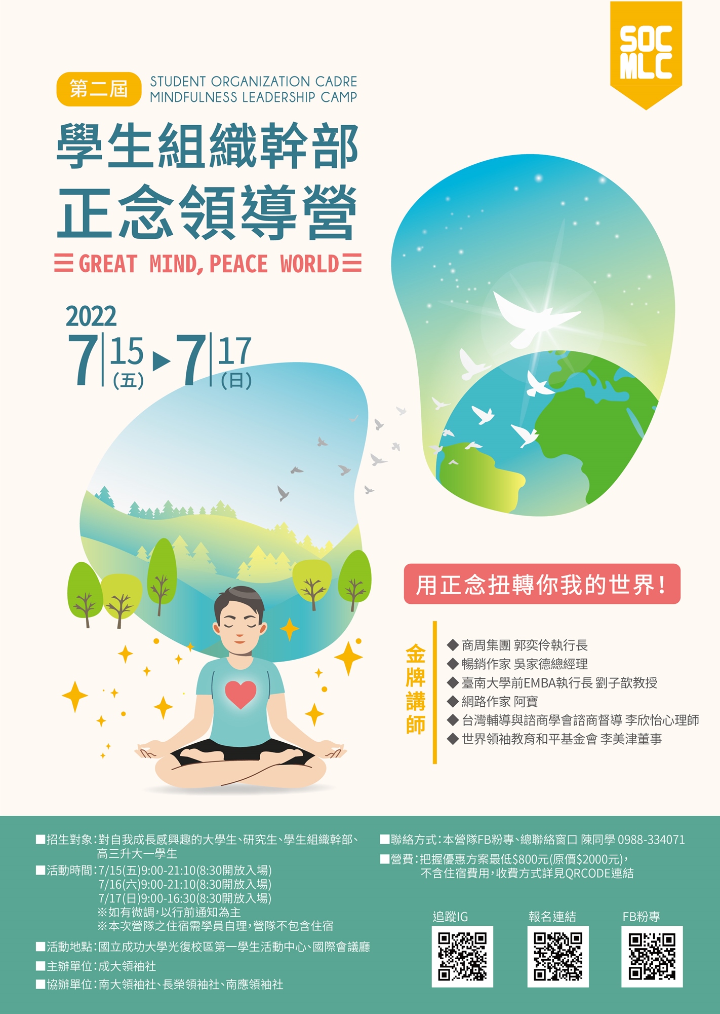 那麼你一定要來參加這次眾星雲集的「學生組織幹部正念領導營」!