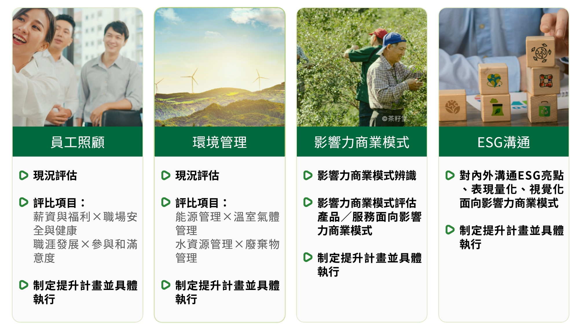 2024年由B型企業協會發起,與嘉威聯合會計師事務所、國立政治大學信義書院等倡議合作夥伴推動「台灣中小企業ESG聯盟 Business FOR Good 計畫」,以 國際ESG標準BIA(B Impact Assessment)為指引,共同促進企業轉型ESG,透過員工照顧、環境友善、影響力商業模式、ESG溝通等四大系列課程,讓企業輕鬆一手掌握ESG!