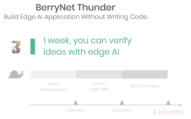 - 有了 BerryNet Thunder,再也不需要花一年半培訓人才, 只需要一週入門快速上手,接下來每次更新僅需數分鐘至數小時,就能快速且反覆驗證你的 edge AI 點子。