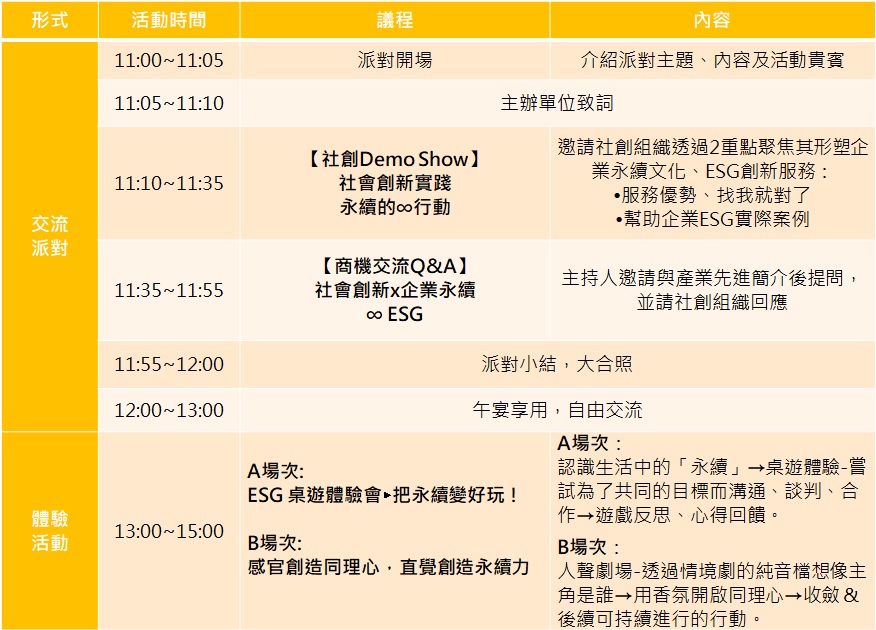 邀集國內關注ESG永續議題之產業先進、單位、民眾與社會創新組織一同對話永續的創新行動,並以社會創新如何加速公司內部永續文化形塑方案、協助企業產出ESG行動實例為核心,促進公司推動永續治理的更多可能。並接續午宴享用時間,在放鬆心情與滿足味蕾之中,促進產業先進與社創組織交流的愉快時光。