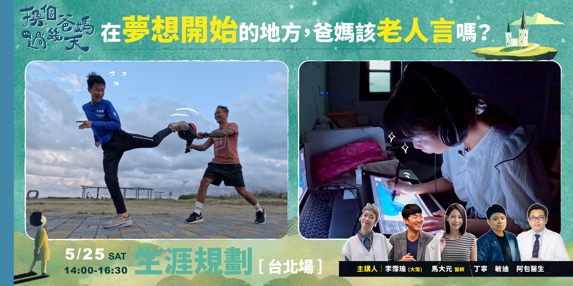 台北場 5/25(六) 14:00-16:30 | 生涯規劃 | 李霈瑜(大霈)X 馬大元 X 丁寧 X 敏迪 X 阿包醫生 |