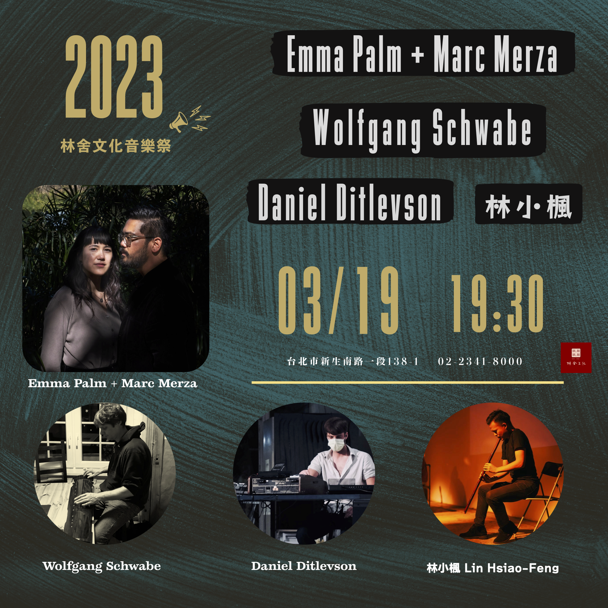 2023『林舍文化音樂祭』,第一場演出,邀請來自美國加州的二人組合Emma Palm 與 Marc Merza ,Emma Palm將帶來其音樂製作項目『No Translation』,同場也邀請目前旅居台灣的美國聲音/噪音藝術家Daniel Raymond Ditlevson (戴典瑞)、Wolfgang Schwabe(施維禮)一同參與演出!