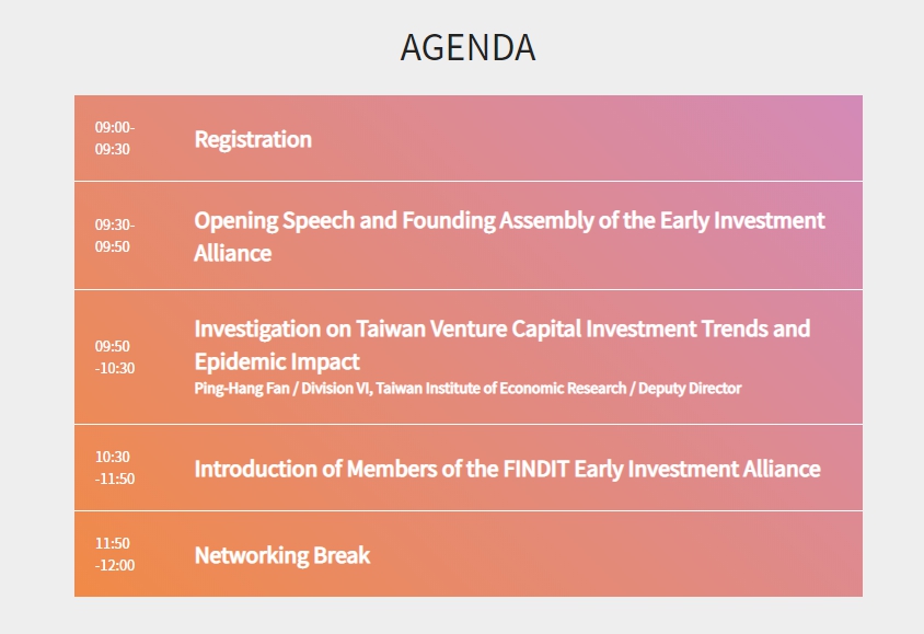 為掌握全球早期投資市場商機的脈動,協助新創企業取得資金、知識、拓展國際連結,經濟部中小企業處委託台灣經濟研究院於2020年8月26日(三)於交通部集思會議中心辦理「台灣早期投資論壇」,邀請知名創投公司、天使投資人、加速器、知名企業龍頭等進行與談分享以及出席十分鐘閃約媒合活動上(報名已結束),以促進國內中小企業、新創事業團隊與創投業者交流,協助企業國際曝光增加知名度。活動內容涵蓋:(1)台灣新創獲投趨勢;(2) 早期投資聯盟成立大會(3) 聯盟機構簡介 (4)閃約媒合會上(報名已結束),期望藉由投資機構和新創企業的經驗與前瞻洞見分享,增加投資人與新創企業曝光度及互動交流,帶動國內早期投資的風氣與優化創業生態系統。