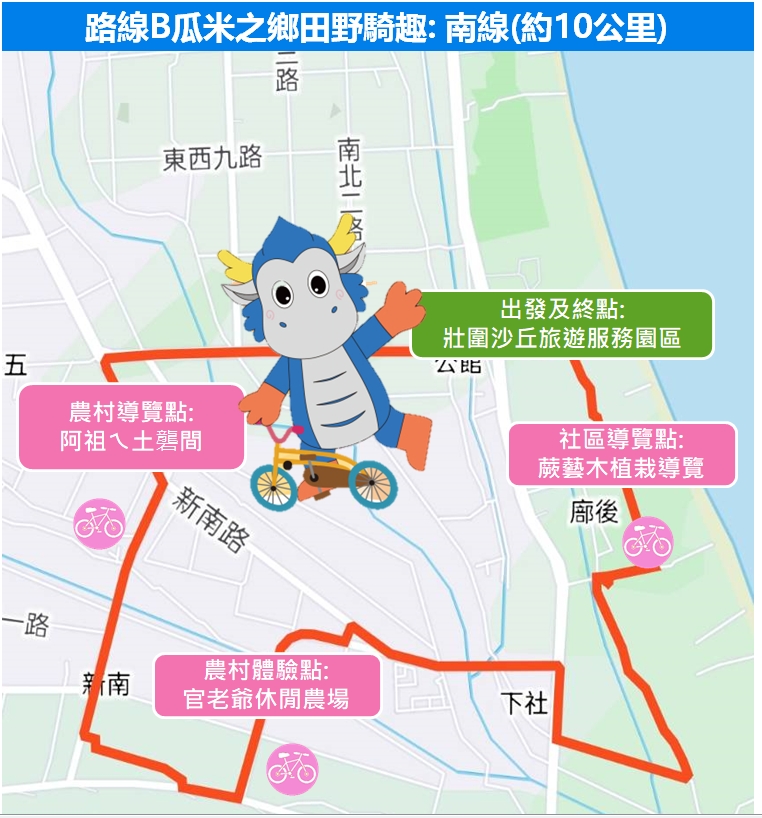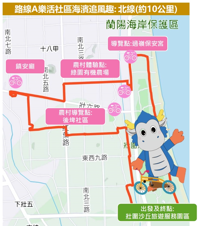 騎乘路線:壯圍沙丘旅遊服務園區->過嶺保安宮->綠園有機蔬菜農園(苦瓜茶品嚐)->鎮安廟->後埤社區導覽->壯圍沙丘旅遊服務園區