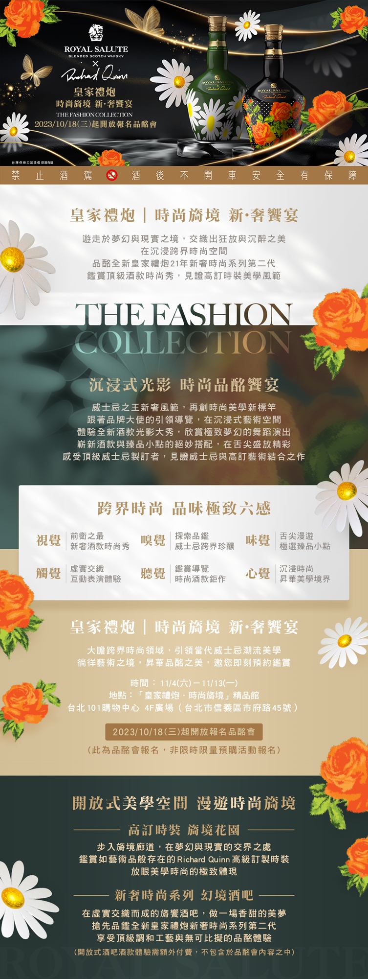 3.凡參加皇家禮炮 「時尚旖境 新‧奢饗宴」品酩會,每位貴賓可獲得Richard Quinn所設計的新奢時尚系列迷你酒乙瓶 (迷你酒款式為新奢時尚系列第一代或第二代,現場隨機分配,不可指定,亦不得更換)
