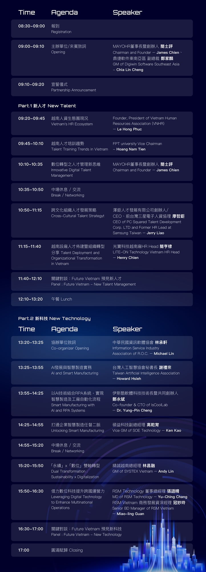 9/11(三) 09:00-17:00胡志明場熱烈報名中,我們誠摯地邀請您蒞臨《新科技·新人才·預見新越南》,與產業先進、專家以及其他與會來賓交流、分享與互相學習,一同了解如何在數位化時代中掌握技術優勢,預見未來。