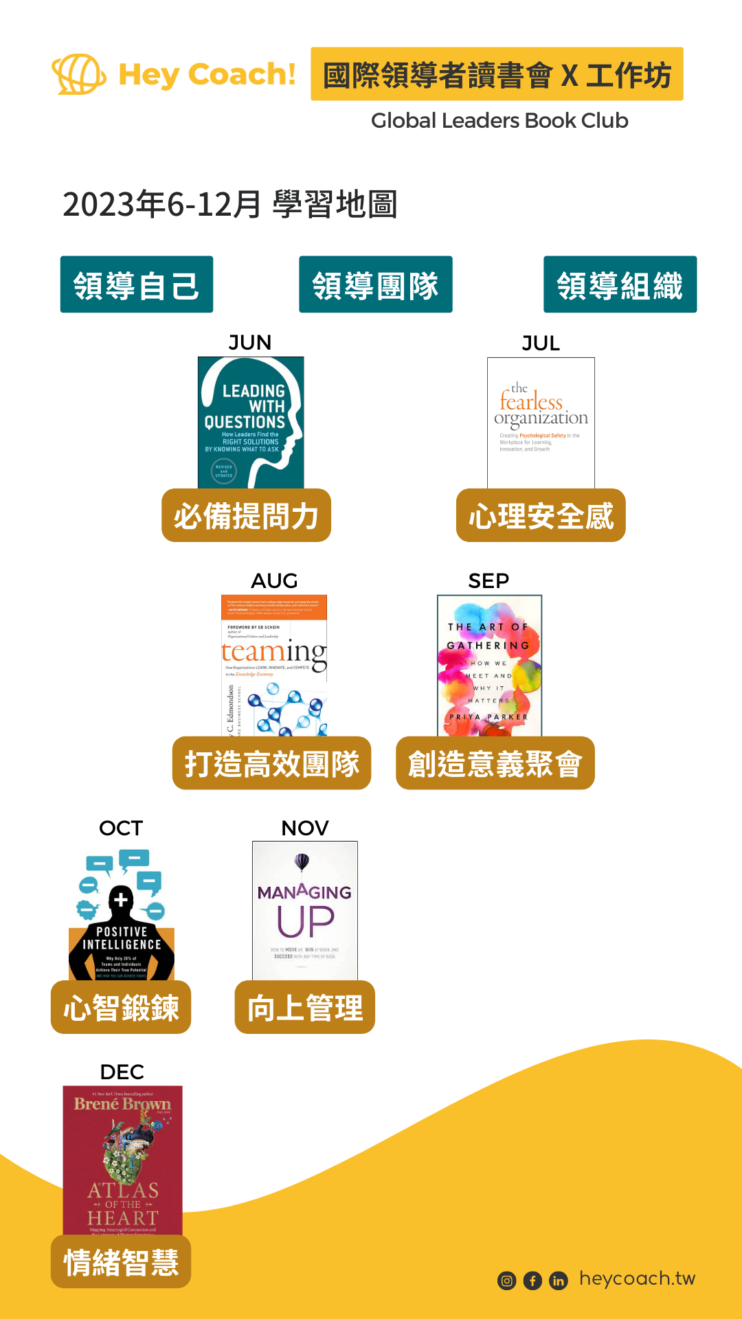我們從「領導自己」、「領導團隊」與「領導組織」三個面向來選書,六月份與十月份會在台灣時間第二週的週六,其餘月份則是台灣時間每月第三個週六早上9:00-11:30。