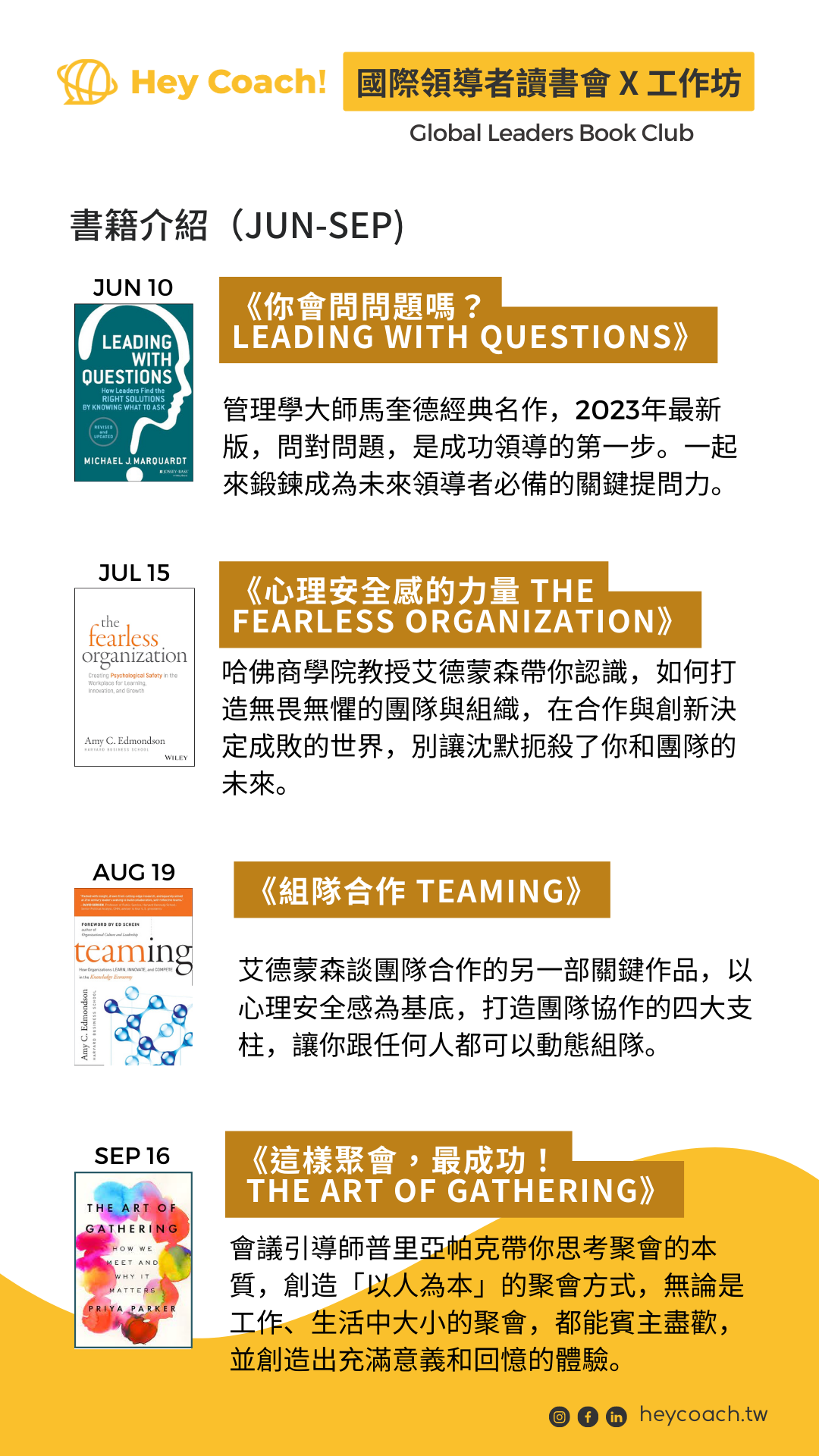 A : 每間公司的需求和適合的主題可能有所不同,我們很樂意協助你找到最適合你組織的學習模式,我們可以進行線上工作坊,或是教導你可以如何在組織內引導本類型的讀書會,歡迎來信 heycoach@letsleadnow.com 與我們聯繫。
