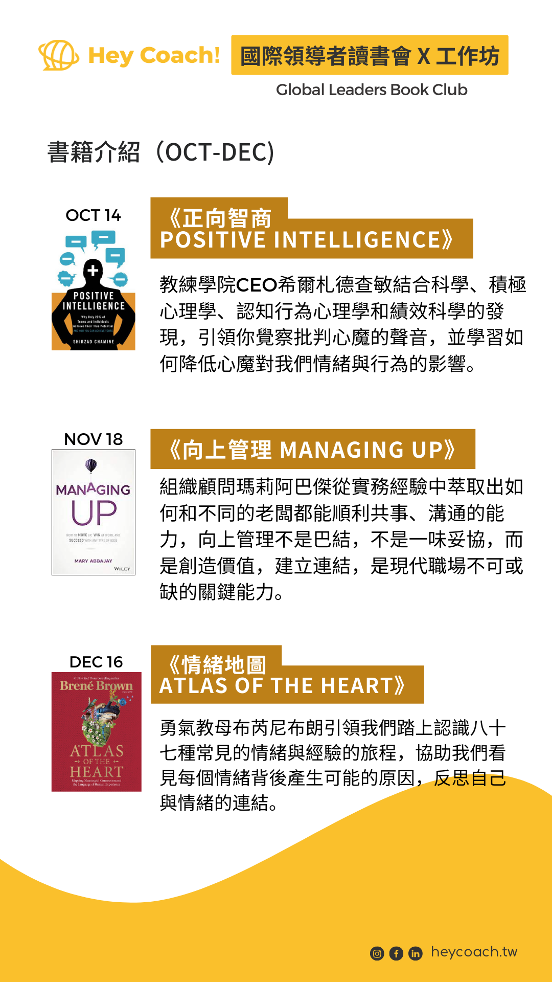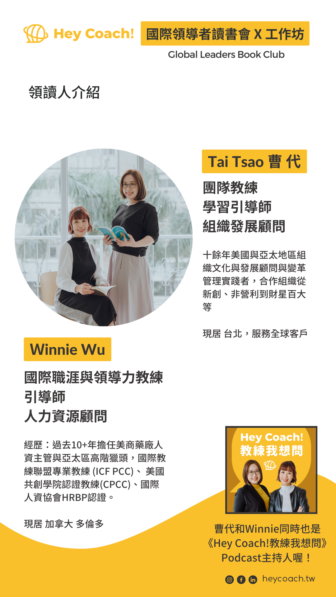 Hey Coach! 具有豐富跨國領導與教練經驗的兩位主理人 Winnie Wu 和 曹 代 Tai Tsao 將會共同帶領線上工作坊,透過精心設計的演練與領讀,不必讀完整本書,也能開始實踐,協助你在2.5小時高效學習暢銷商管、自我成長、歐美經理人趨勢必讀書籍。