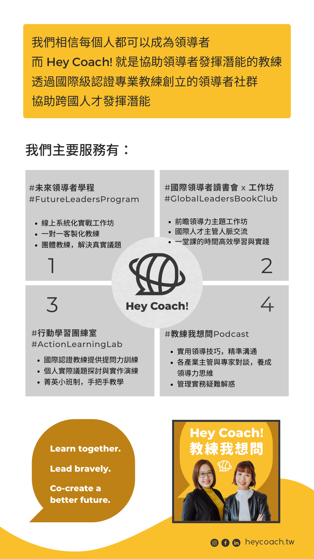 歡迎造訪 https://portaly.cc/heycoach了解更多Hey Coach! 團隊 或追蹤我們的Facebook, Instagram 或 LinkedIn