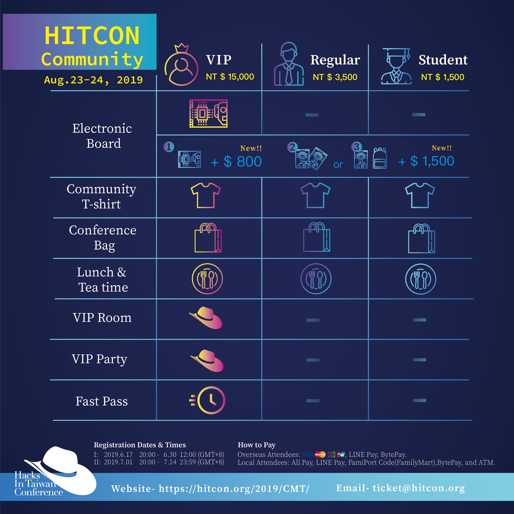 • 此票價享會眾票所屬福利,並另包含 HITCON Communtiy 2019 會議廳快速通關HITCON Community 2019 貴賓室通行權專屬 VIP 晚宴高科技電路板,HITCON Community 2019 專屬電路板詳細規格將於日後公布