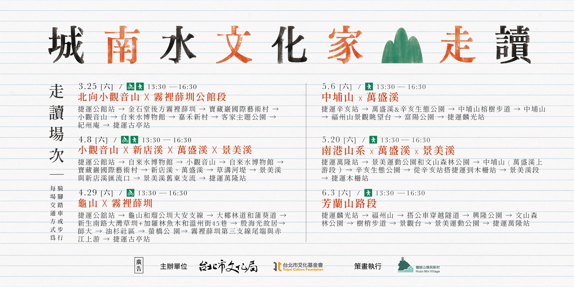 3/25(六) 13:30–16:30 | 北向小觀音山+霧裡薛圳公館段 南昌公園 步行+腳踏車 | 南昌公園→ 紀州庵→客家主題公園→嘉禾新村→小觀音山蓄水池→寶藏巖國際藝術村→金石堂書店後方霧裡薛圳→捷運公館站 週邊活動:寶藏巖光節、4月兒童節「城南有意思」 |