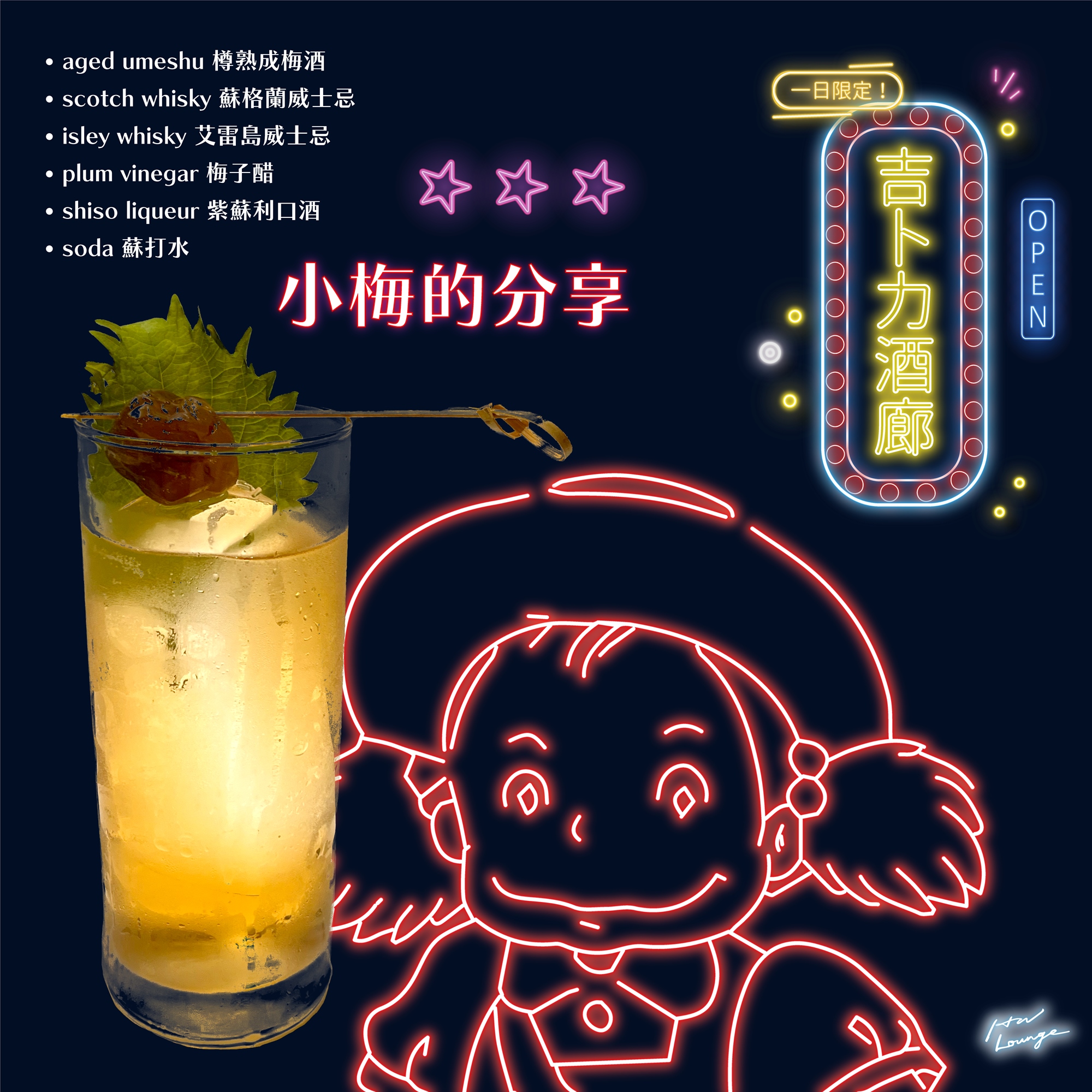 aged umeshu|scotch whisky |isley whisky |plum vinegar |shiso liqueur|soda