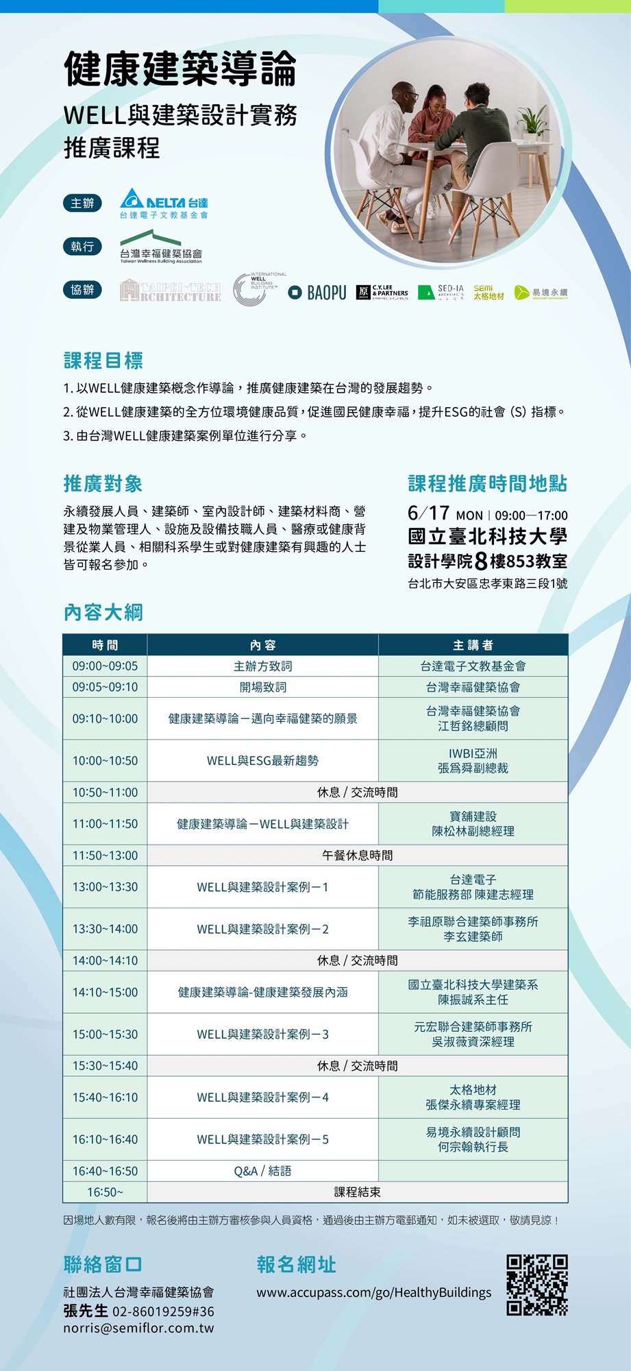 本次課程內容包含導讀健康建築導論,輔以台灣WELL認證案例分享、解決方案說明等規劃,期望帶給學員豐富的知識與課程體驗。