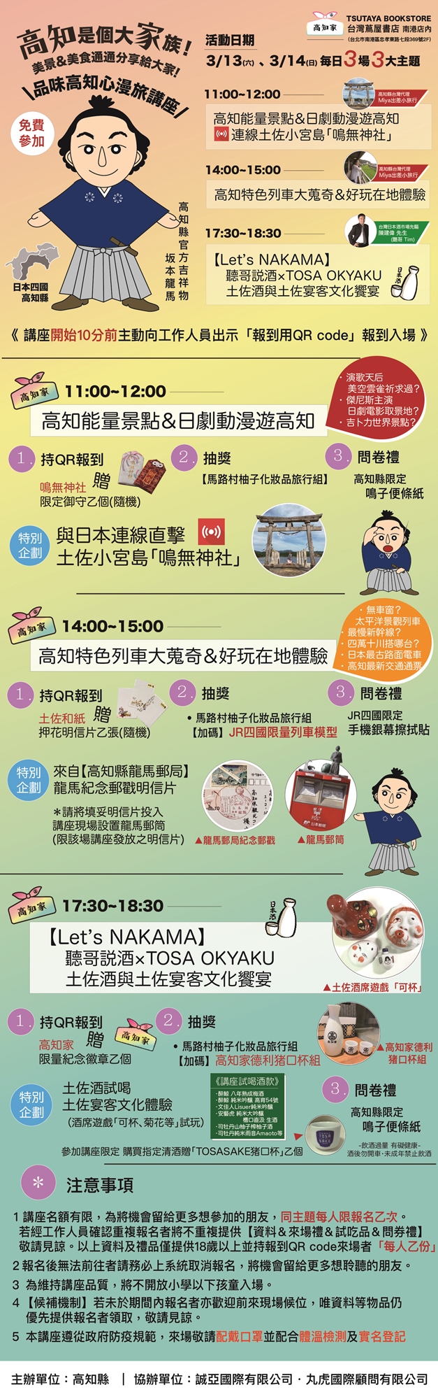 高知縣與台灣蔦屋書店TSUTAYA BOOKSTORE(南港店)於2021年3月~4月推出聯名快閃物產展售活動,並於3/13(六)與3/14(日)於南港店舉辦實體講座活動,每日三場三大主題看高知,歡迎來場偽出國!