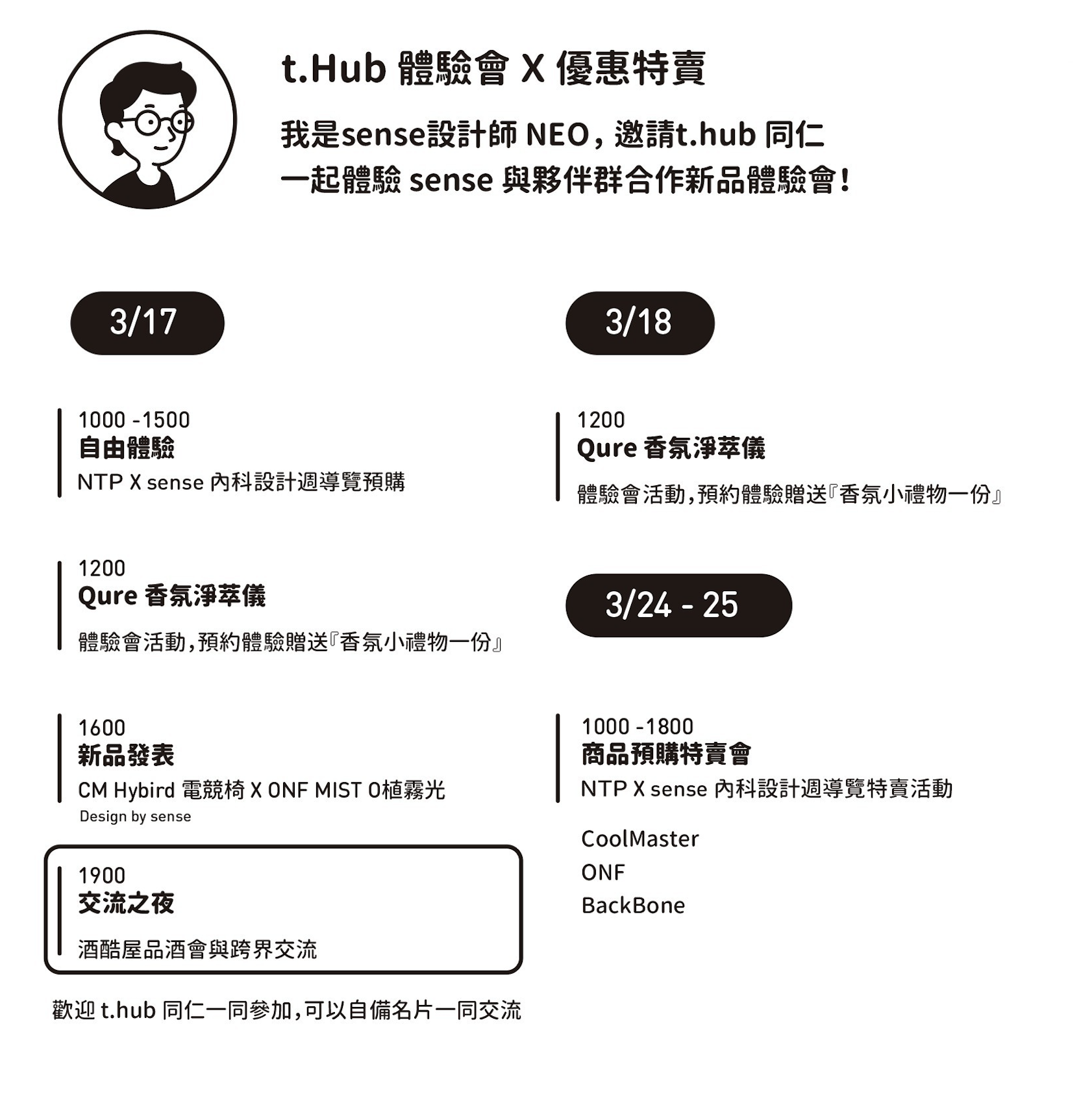 sense. store 限時推出「內科設計周|品牌未來:生活體驗展」概念展,搶在4月中旬正式營運之前,sense.store 推出「NTP Design Week」概念展,3月7日至3月29日期間,精選5個品牌選品,幫助消費者重新定義何美好生活,包含有 ONF 植物光學燈、CoolerMaster 酷碼科技、Backbone 椎座工學、Qure 香氛淨萃儀等與 sense 生活設計展,以「生活新主張」讓設計與生活的距離更貼近。