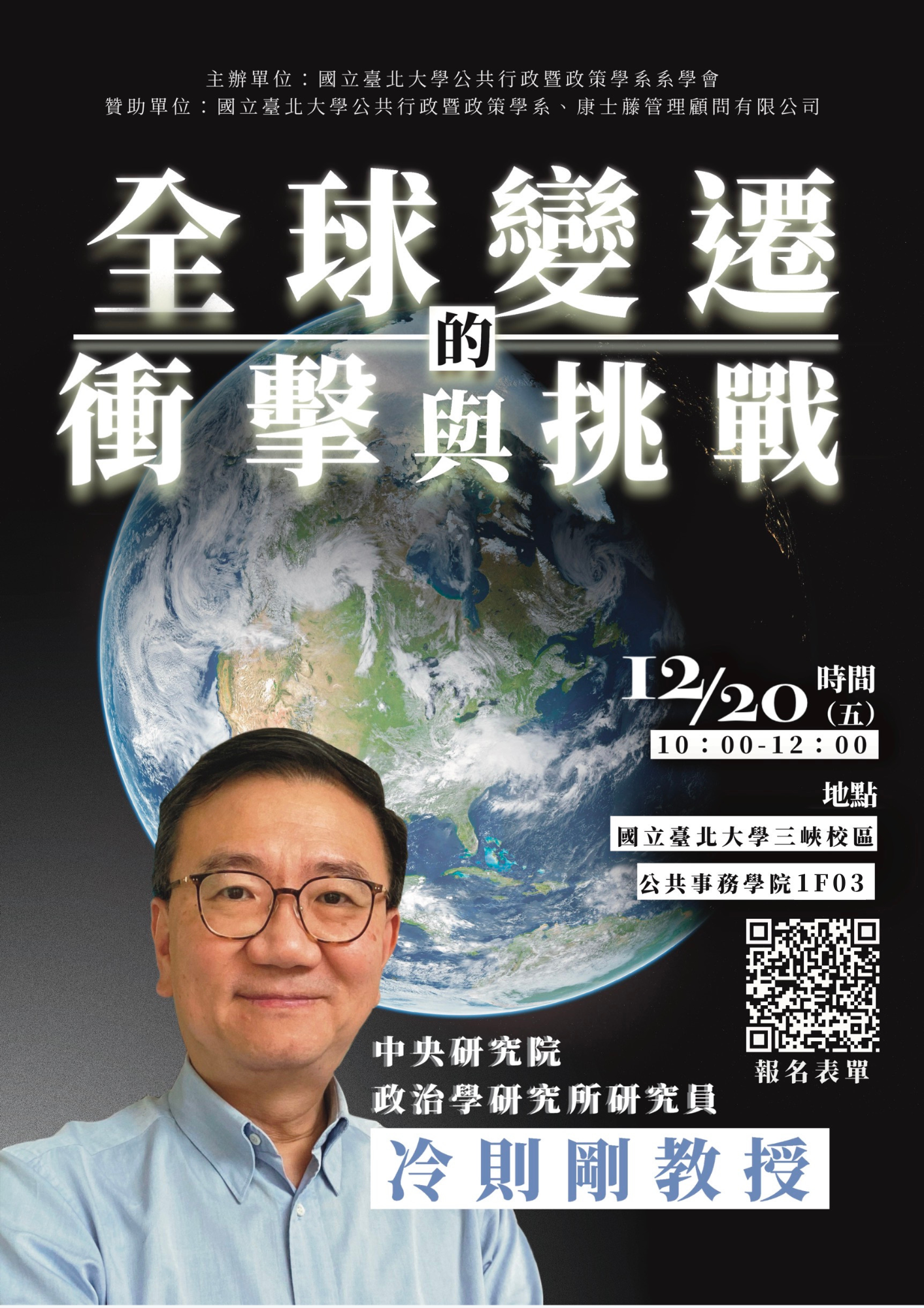 學術講座這次邀請到了【中央研究院政治學研究所研究員】、【國立政治大學政治系合聘教授】冷則剛教授,將以「全球變遷的衝擊與挑戰」為題分享他的研究。