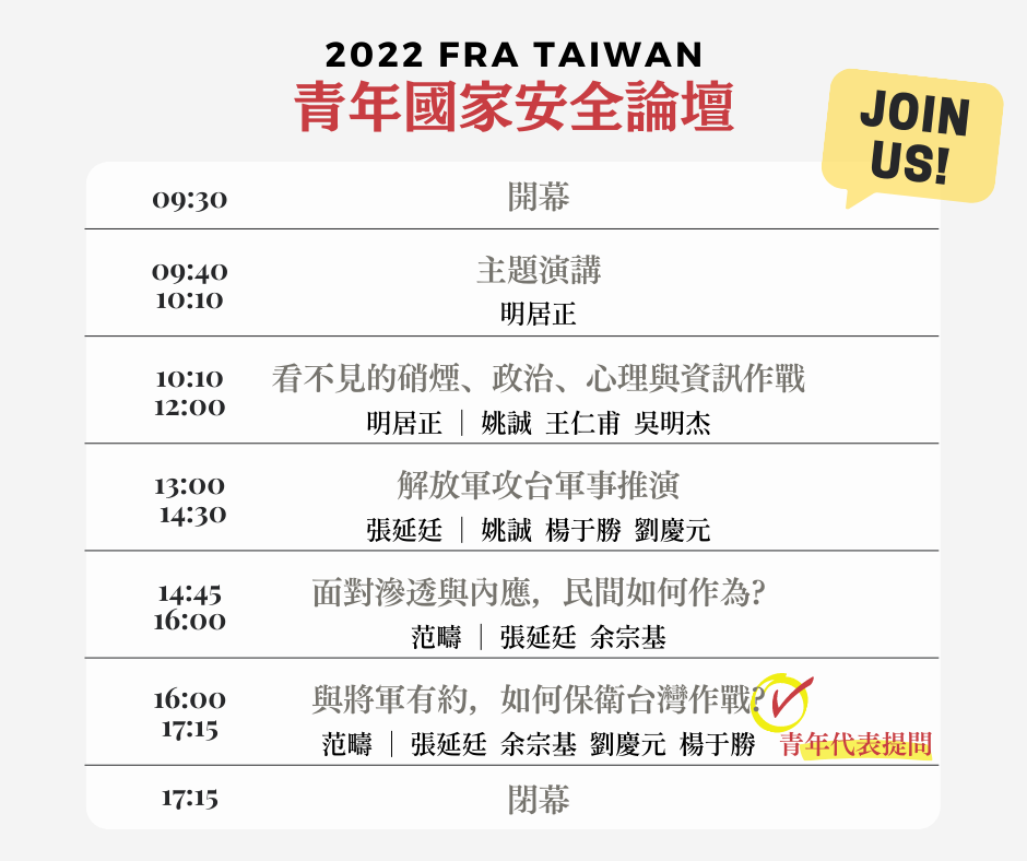 因應青年日漸提升的國安意識以及宣傳軍事常識的呼聲,2022 年1月15日,福和會舉辦《2022青年國家安全論壇》,邀請台灣備役將軍、前中共解放軍作戰專家、軍事政治評論家,與您分析各種角度之策略方案。