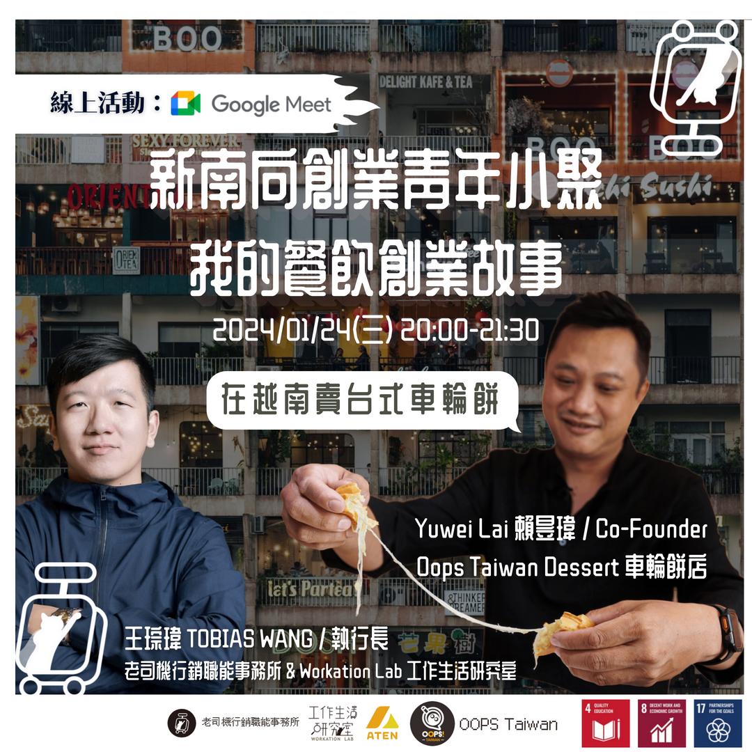 特別邀請到胡志明市知名品牌Oops Taiwan Dessert車輪餅店的共同創辦人Yuwei Lai 賴昱瑋,將與大家分享他在越南當地打拼的獨特心路歷程。透過這場線上交流,你將有機會深入瞭解新南向市場的商機、挑戰,以及創業心得的關鍵要素。無論你是已經在新南向地區經營,還是正打算進軍這片市場的創業者,都能在這次活動中獲得實用的經驗分享,啟發自己的創業夢想。