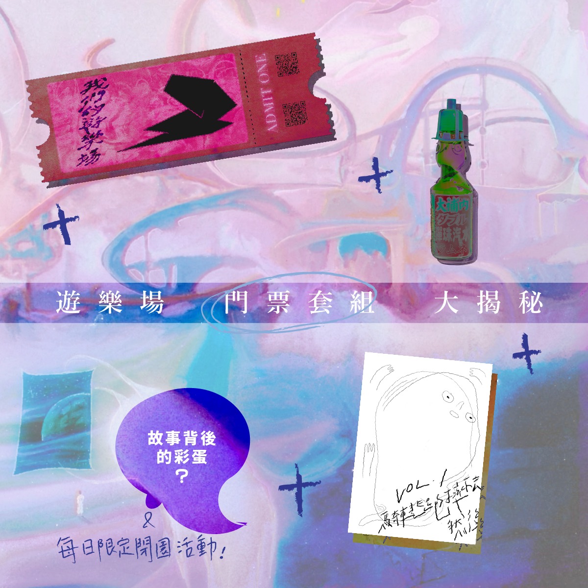 除了看故事如何發生之外,你花下去的錢,還包含一些很酷的東西!像是:一張遊樂場的票券、一本小誌、一個故事後續的故事、一瓶去遊樂園一定要買的飲料。