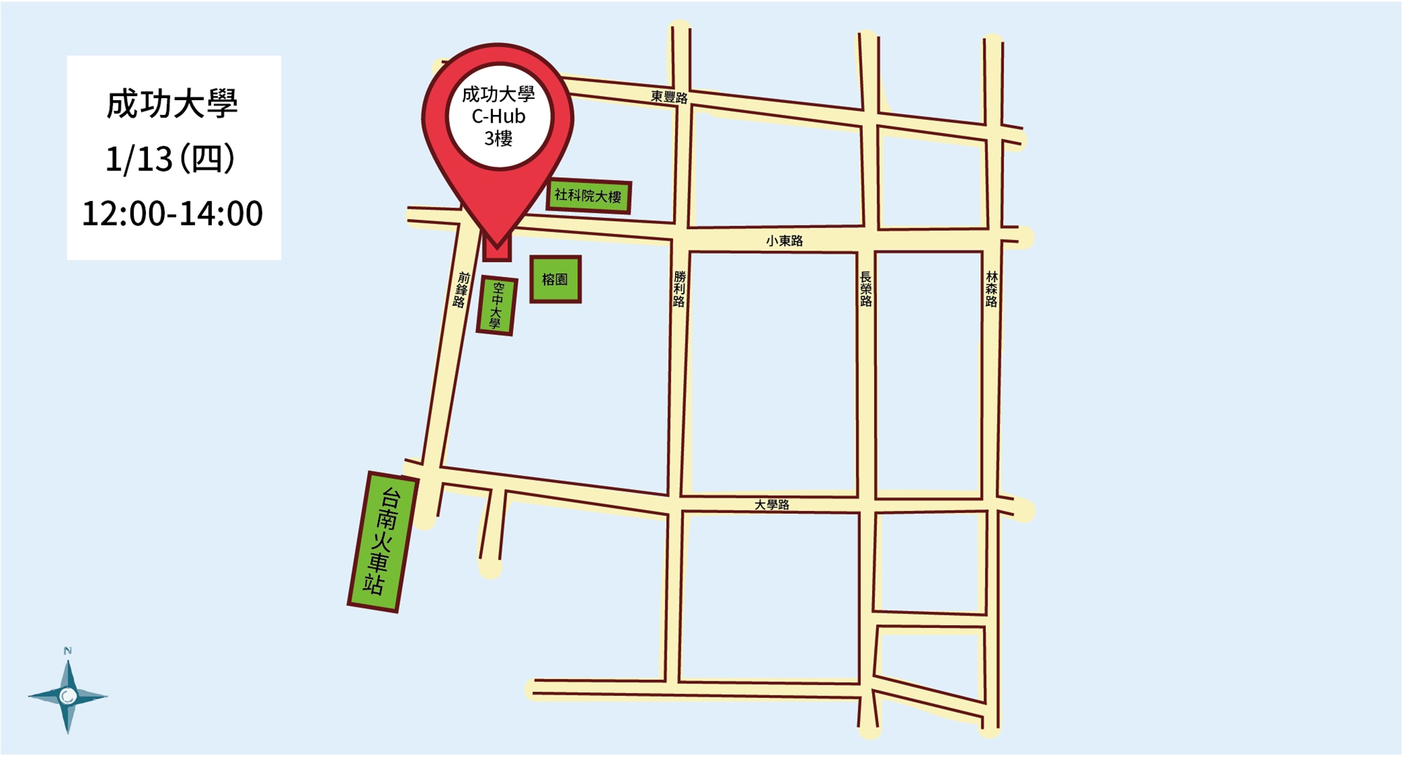1/13(四) 12:00-14:00 | 成功大學 C-Hub 3樓 (台南市大學路1號) |