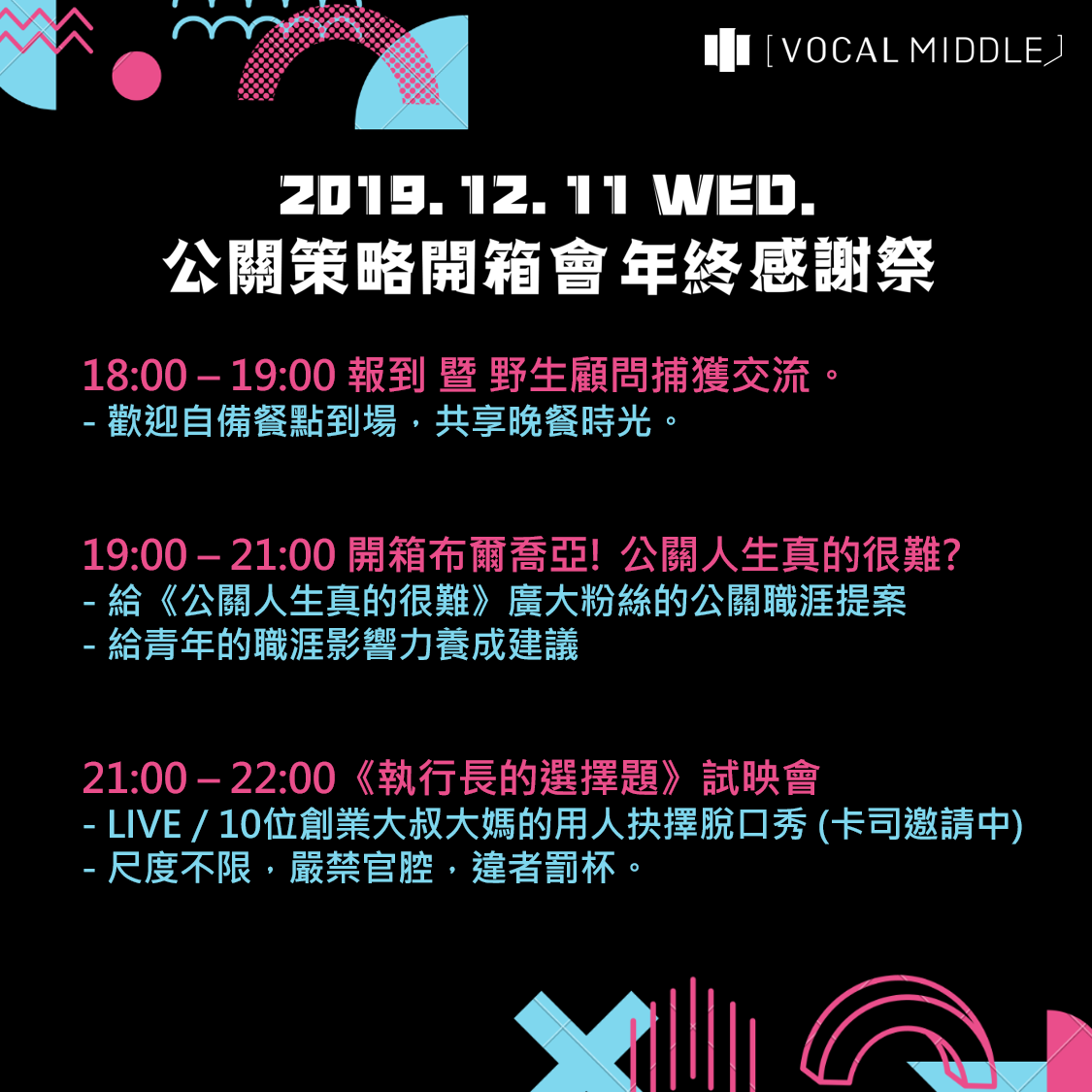 「公關策略開箱會」是 VOCAL MIDDLE 專為「在學朋友」所設計的小型交流講座,自2019年開辦後,每月一次。 2019 上半年以「原來品牌就是這樣煉成的!」為主軸,在主講顧問的引導下,每月鎖定一個「公關操作個案」進行探討,拆解公關策略擬定的過程、檢驗其成效、「開箱」品牌煉造的過程。 2019 下半年則以「那些因『公關』」而改變的事」為題,探討「公關」這門專業如何發揮影響力,滲透大眾生活、商業環境、以及個人職涯,同時安排「鐵粉工作坊」,搭配實作演練,一起揭開「公關」神秘的面紗!
