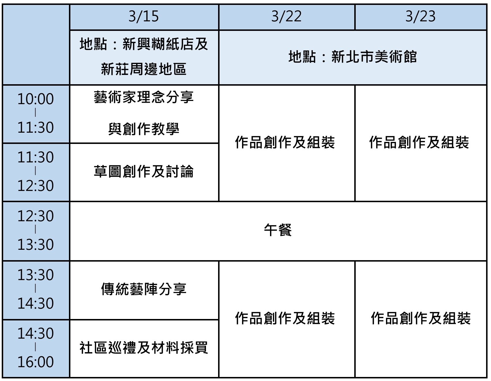 *傳統藝陣分享由中研院臺灣史研究所研究員謝國興主講,其餘場次均由藝術家張徐展帶領。