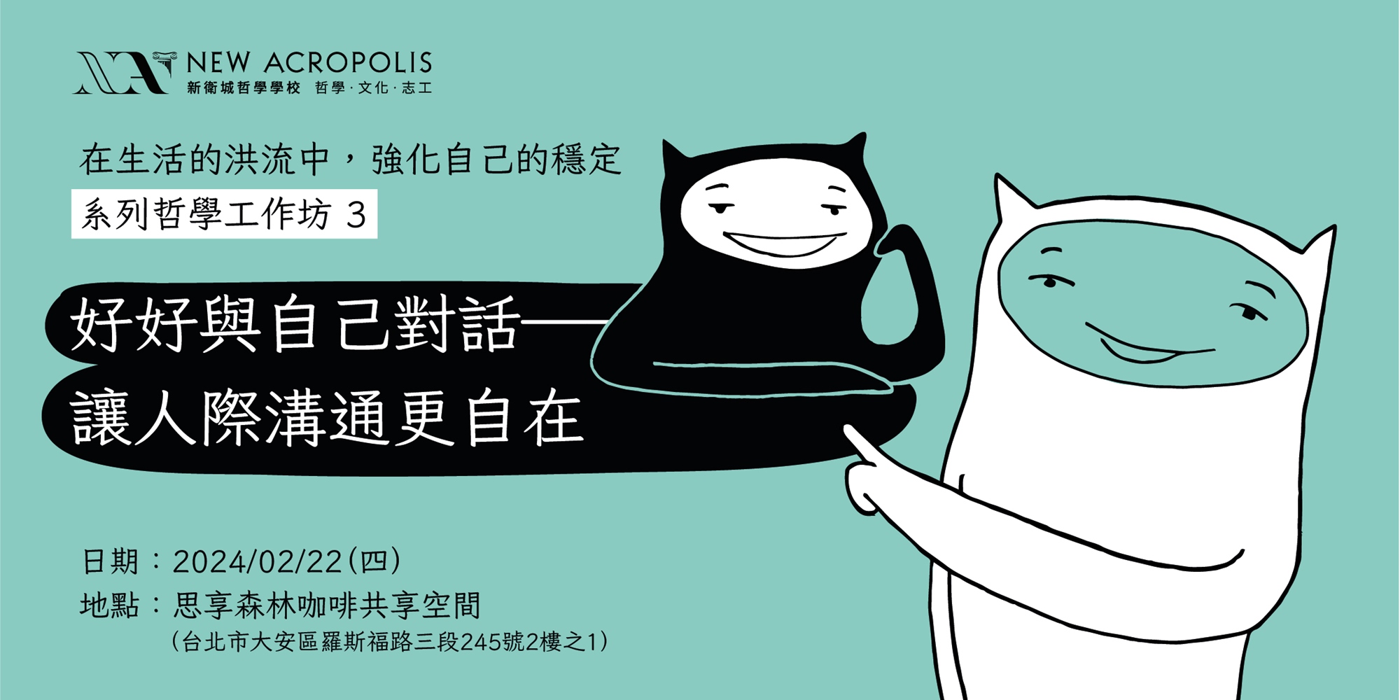 在這場工作坊,我們將介紹一個生活哲學的觀念與方法,帶領大家體驗「與自己對話」,透過轉化與自己的關係,進而轉化與他人的關係,讓人際溝通愈來愈自在。