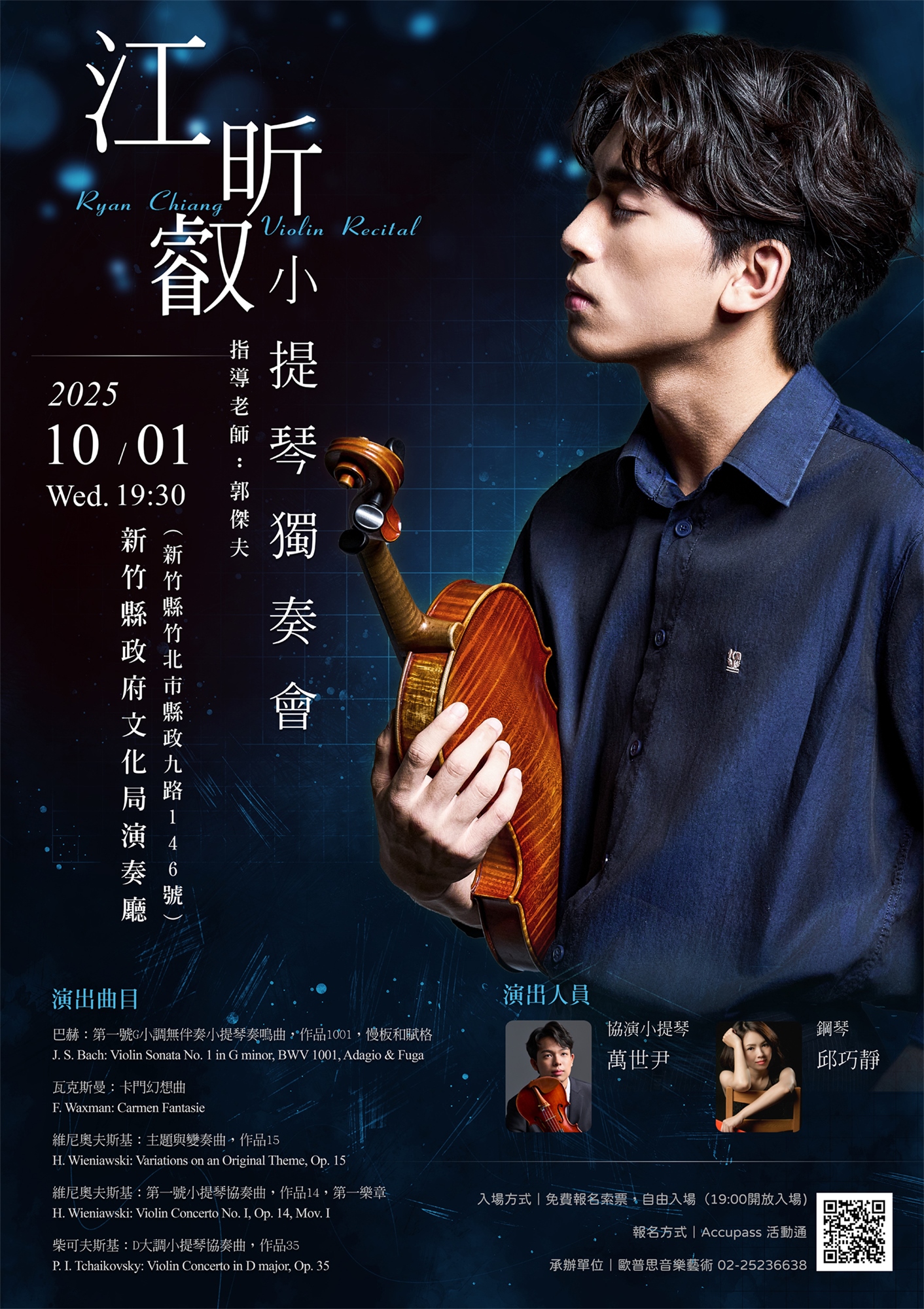 演出曲目涵蓋巴赫《第一號無伴奏小提琴奏鳴曲》選段、維尼奧夫斯基《主題與變奏曲》、以及柴可夫斯基《D 大調小提琴協奏曲》等經典作品,展現小提琴豐富的音色與詮釋力。鋼琴由邱巧靜老師擔綱合作,亦邀請好朋友萬世尹共同演出維尼奧夫斯基《第一號小提琴協奏曲》與瓦克斯曼《卡門幻想曲》,為本場音樂會增添多元層次。