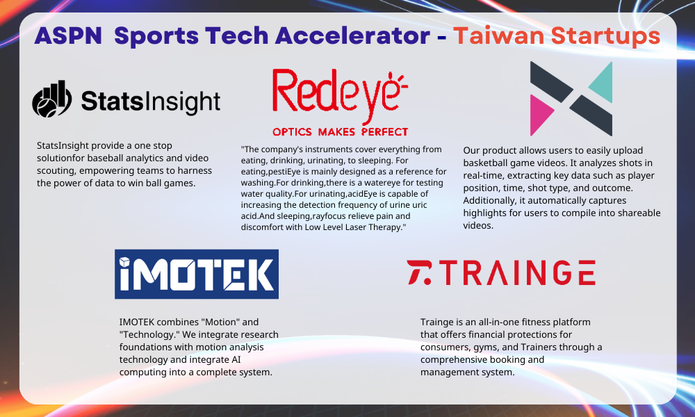 ASPN Sports Tech Accelerator is Asia's first and biggest sports innovation ecosystem. With the support of Sports Administration, Ministry of Education Taiwan and executed by IAPS ( Center of Industry Accelerator and Patent Strategy, NYCU), the new Sports Tech Innovation Accelerator Program integrates the 10 member countries of ASPN in the Asia-Pacific region and international accelerator partners to establish an entirely new sports innovation ecosystem in the Asia-Pacific region.