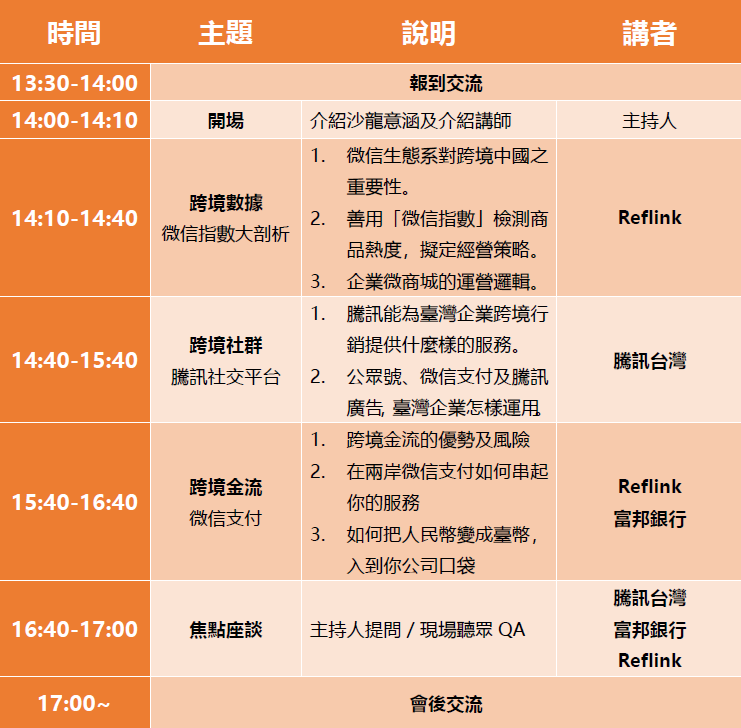 這些問題,現在不再無解!本次活動,特邀請到「RefLink數字營銷集團」、「騰訊官方」與「台北富邦銀行」,與大家分享微信操作的最新趨勢、如何直接以台灣公司身分申請公眾號,以及微信上新經濟「微信商城」的操作方式;另外也將告訴大家怎麼運用微信支付,讓你在台灣做電商,也能直接透過台灣的銀行合法賺進人民幣。