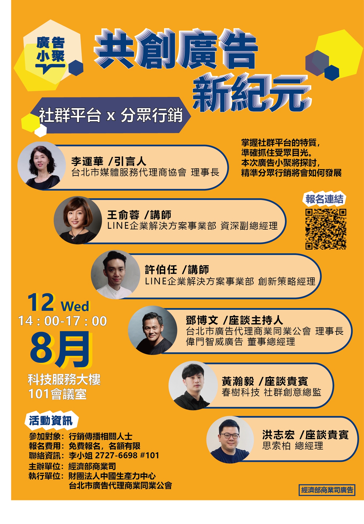 📍活動將邀請MAA 李運華理事長擔任引言人,並由LINE企業解決方案事業部資深副總經理 王俞蓉、創新策略經理 許伯任兩人進行1小時的精彩演講。緊接著TAAA理事長 鄧博文、 MAA理事長 李運華、春樹科技社群創意總監 黃瀚毅及思索柏總經理 洪志宏將會一同加入座談,並接續Q&A時間開放問答交流。