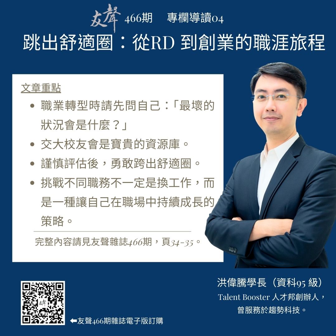 - 交大台北校友會候補理事。交大友聲雜誌專訪、專訪2。