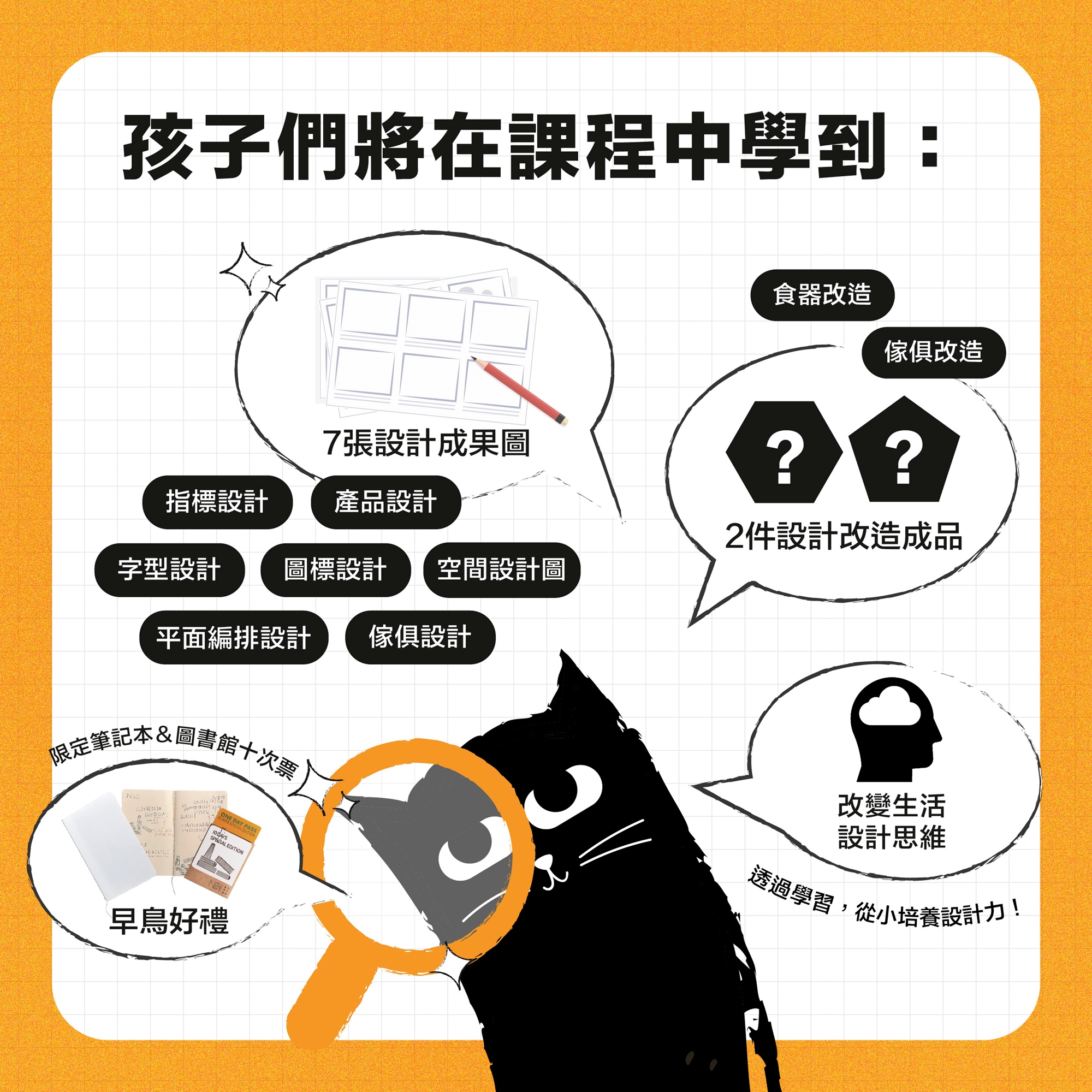 1. 從生活的角度認識設計,透過活動、課程引導,激發孩子的興趣與創造力。