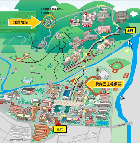 由政治大學正門(山下校區)進入之後,往山上校區,並順著上圖中的黃色箭頭的指示走即可。離校時,一出研究暨創新育成總中心大樓右轉,順著環山二道接環山三道下山。