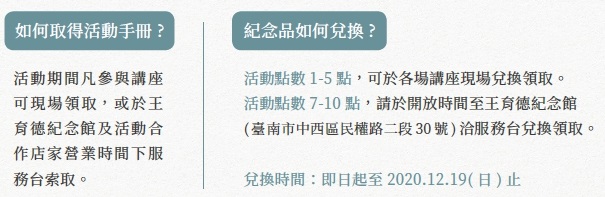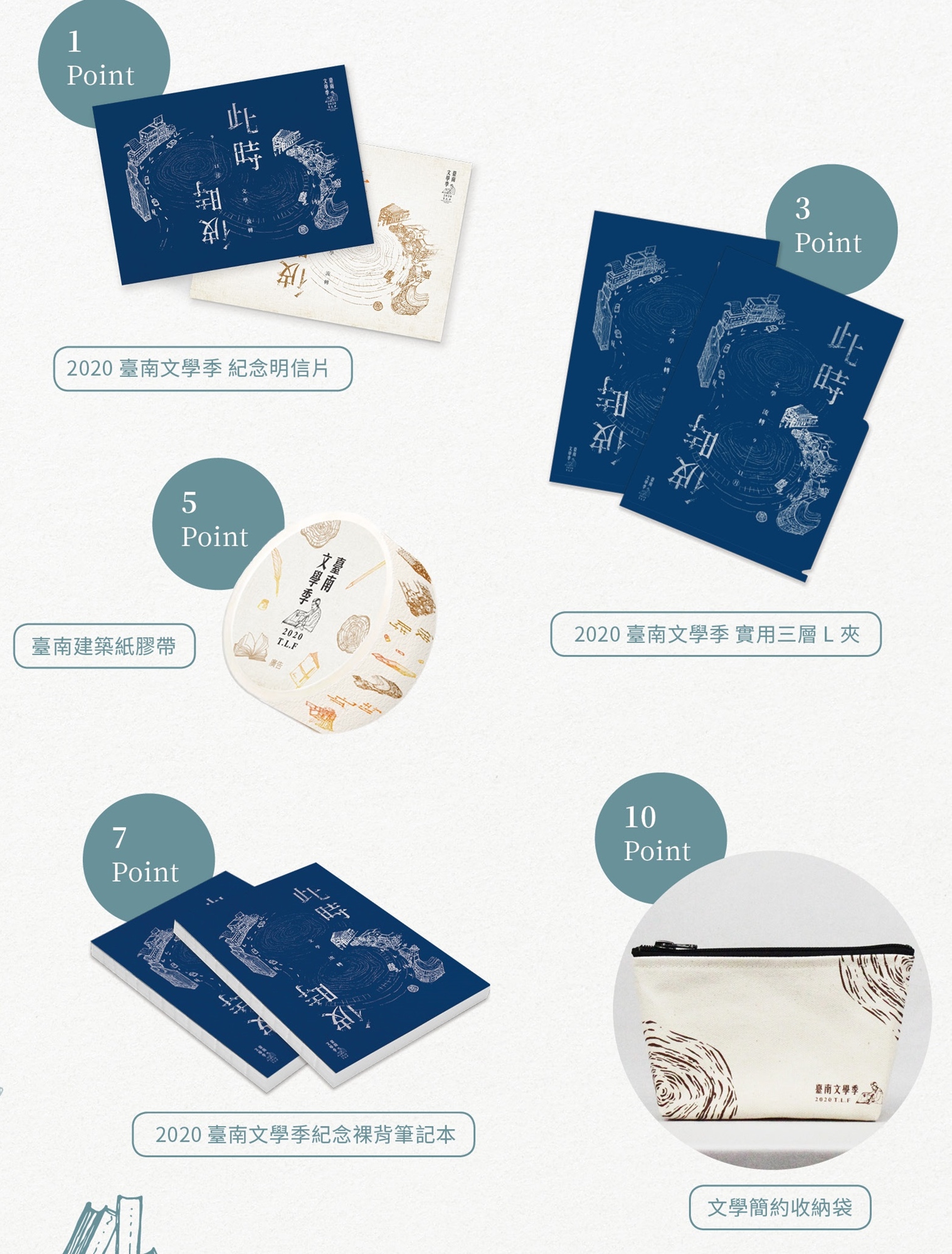 凡於活動期間內參與2020 臺南文學季講座活動: 文學沙龍、作家走讀、南寧文學家、sing 臺南之歌之講座、葉石濤紀念館八週年館慶( 不包含校園講座及文學營活動),皆可參與集點,一場即得一點,需於活動當日結束找工作人員蓋章,所集的點數可兌換文青紀念品,數量有限,換完為止。