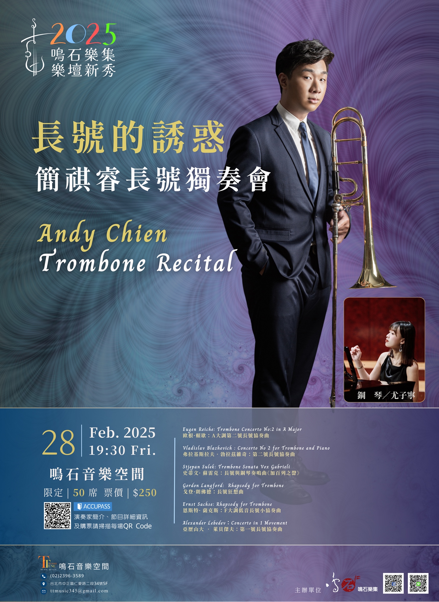 此音樂會是由長號以及鋼琴的傳統編制,當銅管的共鳴聲與鋼琴的琴弦碰撞,當低音的和聲與旋律交織,身為觀眾的您將會感受到每一顆音符化為內心最深處的悸動,沈浸在長號獨有的魅力與誘惑。