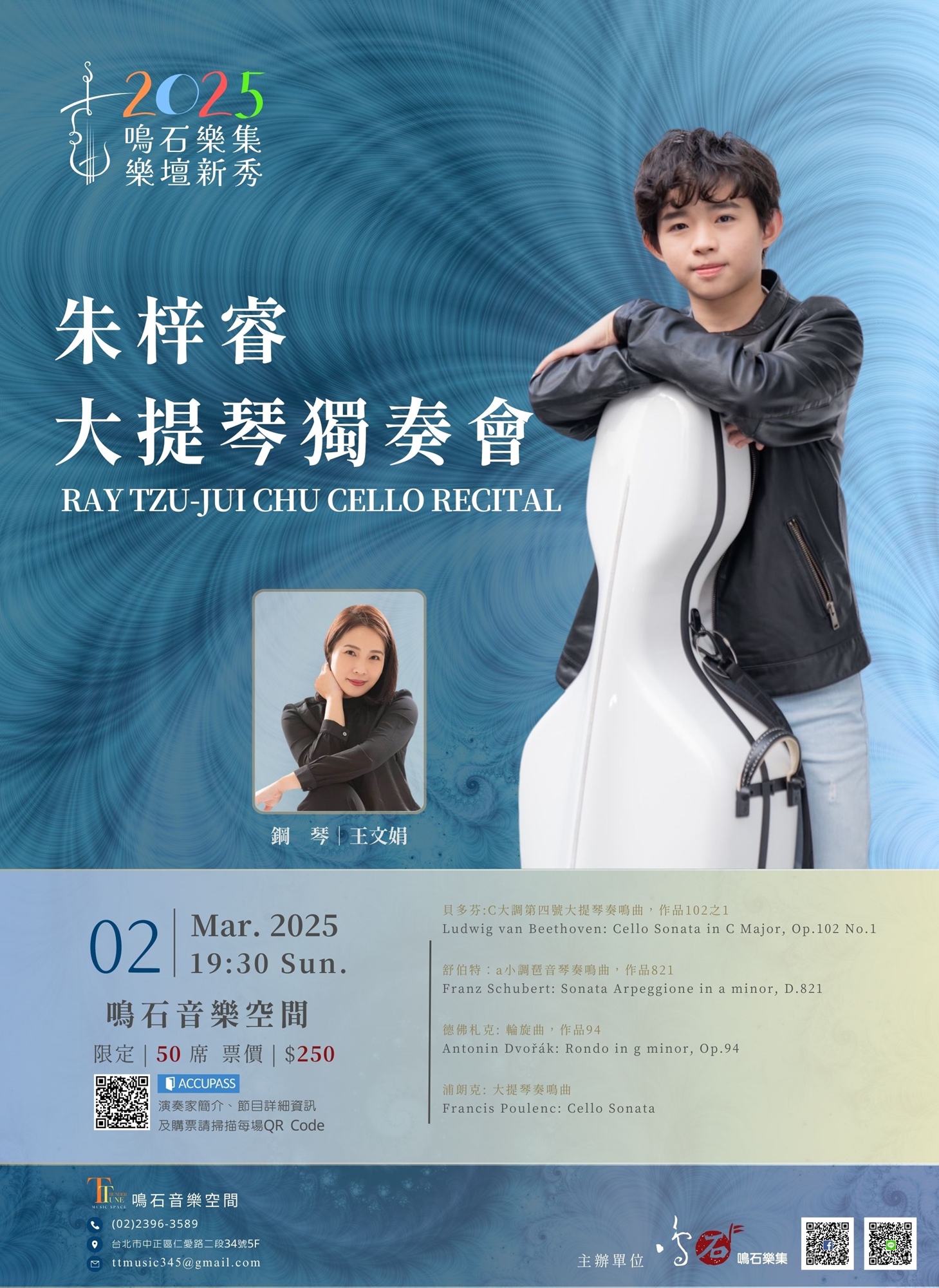 自幼便充分展現音樂天賦,朱梓睿於5歲半開始學習大提琴,並開啟了他對大提琴情有獨衷的熱愛。本場音樂會曲目以室內樂奏鳴曲為主軸,上半場將帶來貝多芬情感豐沛的《C大調第四號大提琴奏鳴曲》及舒伯特的《a小調琶音琴奏鳴曲》;下半場將安排演奏德佛札克的《輪旋曲》與浦朗克歡樂的《大提琴奏鳴曲》,朱梓睿期待透過演繹經典的作品來與大家分享他在音樂中所獲得的喜悅與滿足。