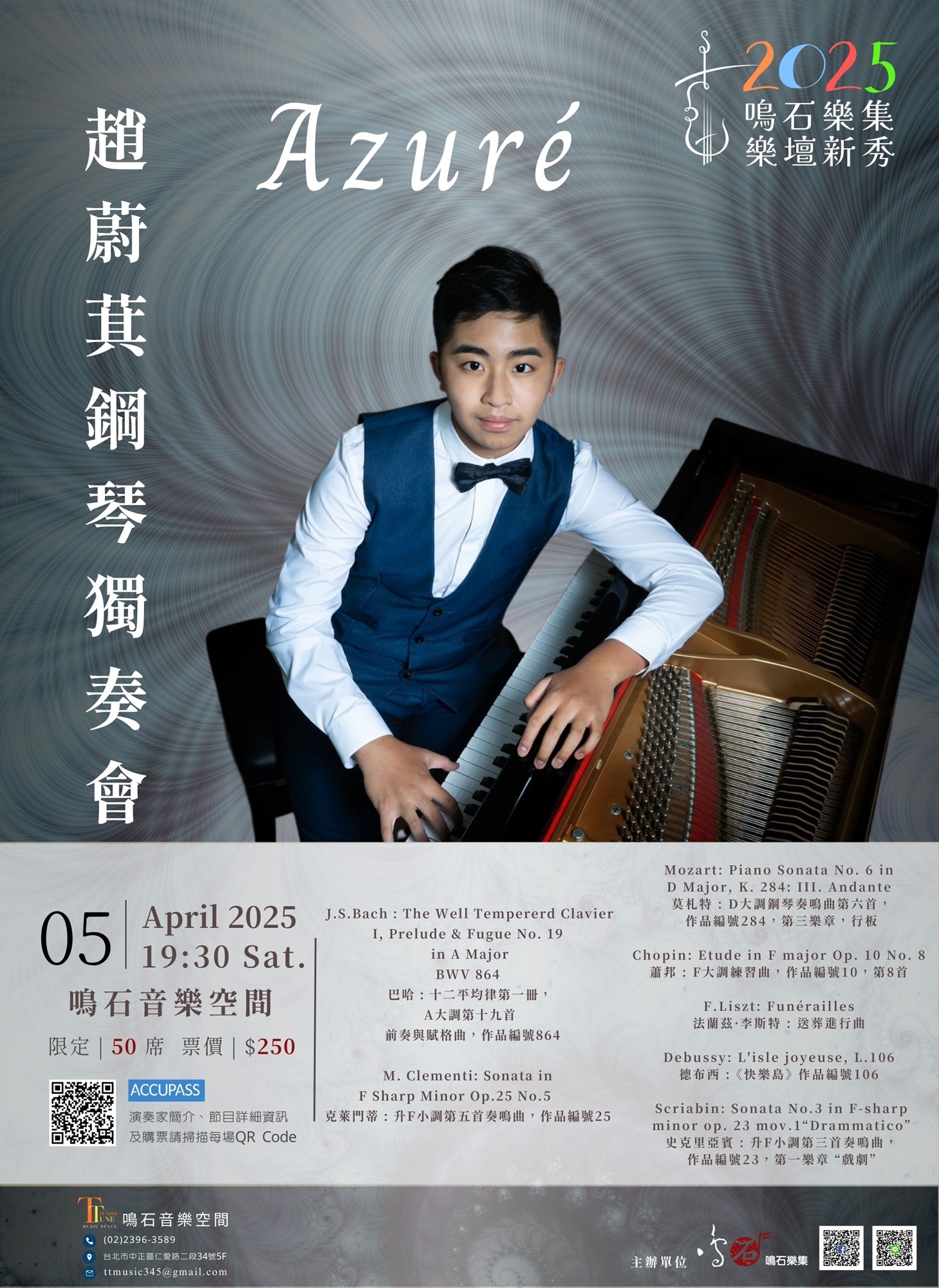 《Azuré》趙蔚萁鋼琴獨奏會,將呈現鋼琴樂音於不同時期之風貌, 含沉穩、甜美、內斂、歲月…等不同面貌,讓琴音演譯多角。 本次曲目帶來德、義、波、匈、法、俄 多國曲風,希望帶給大家豐富的聽覺感受。