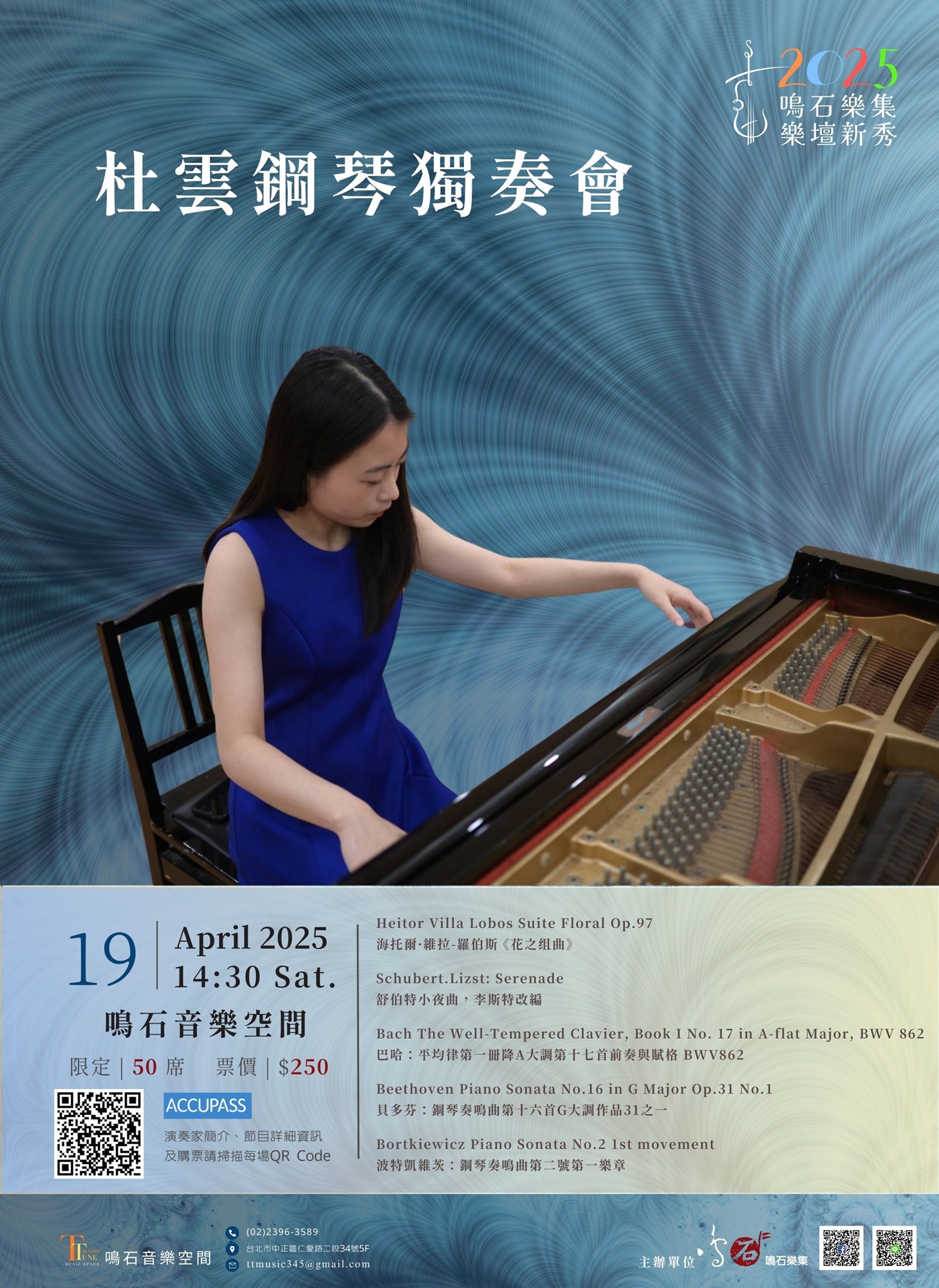 杜雲,2007年,出生基隆,喜愛美食及音樂。8歲學鋼琴,11歲學小提琴,9歲參加台北文化盃得到三年級組第三名。國中考取成功國中音樂班,目前就讀新店高中音樂班。鋼琴曾師事何育真教授,謝賜美老師,嚴慶娟老師,現師事林玉淳教授。