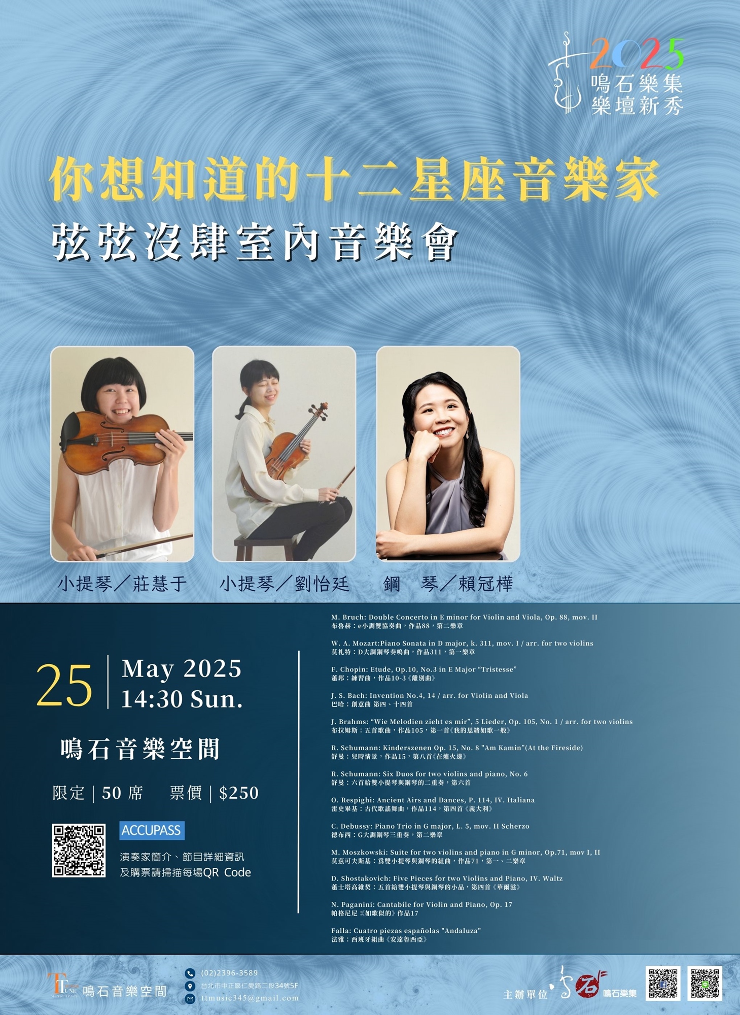 弦弦沒肆成立於2023年末一個突發奇想的清晨,由兩把小提琴發起,有時加入鋼琴。無聊時改編一些曲子,湊不足四個人也能盡情玩音樂。如果您閒閒沒事的話就一起來聽音樂吧! 大家對於十二星座一點都不陌生,而在這些星座裡頭分別又誕生了哪些偉大的音樂家呢?今天的音樂會將帶領大家從一月摩羯座到十二月射手座一路介紹過來。聽著這些星座的性格和音樂家們的小故事,在欣賞他們的作品時,是否會增添不一樣的體會呢?