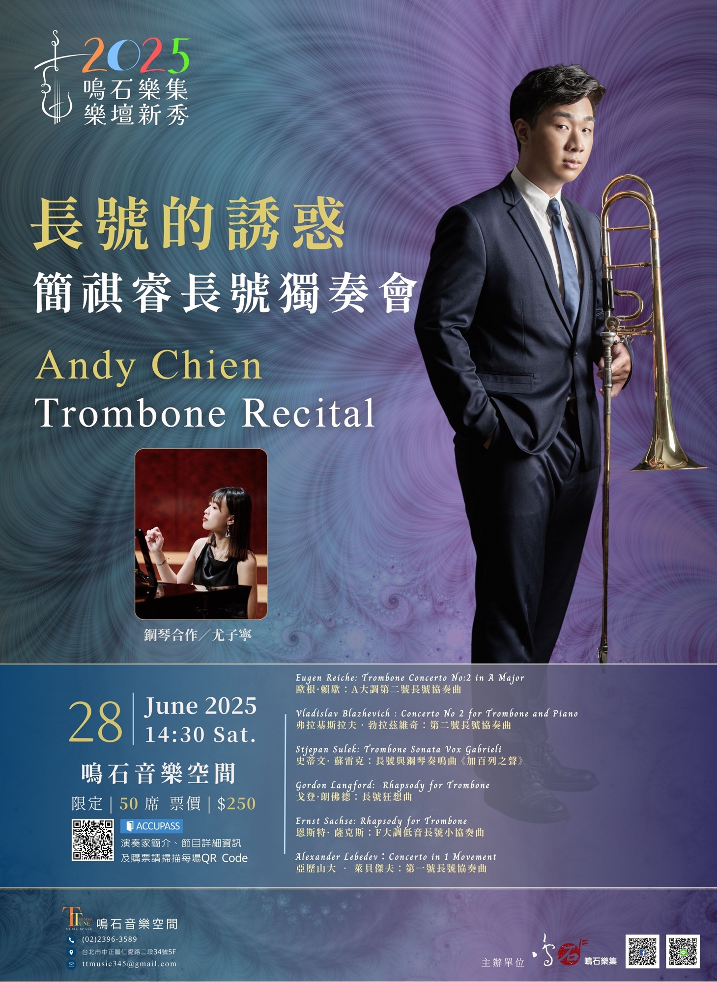 此音樂會是由長號以及鋼琴的傳統編制,當銅管的共鳴聲與鋼琴的琴弦碰撞,當低音的和聲與旋律交織,身為觀眾的您將會感受到每一顆音符化為內心最深處的悸動,沈浸在長號獨有的魅力與誘惑。