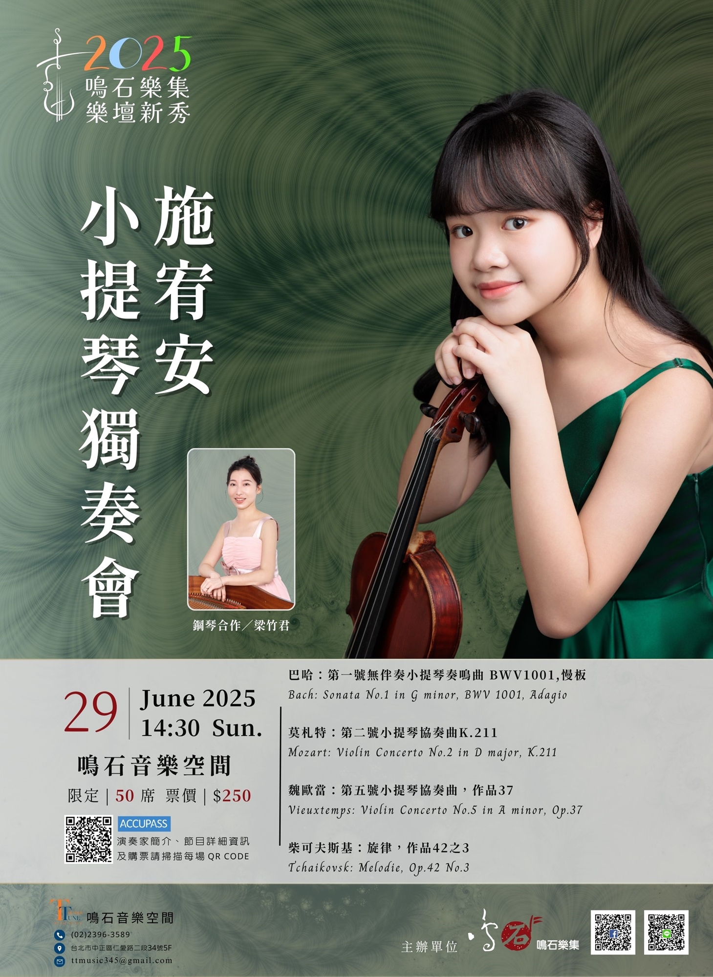 誠摯邀請您蒞臨施宥安的小提琴獨奏會,一同見證她在音樂旅程中的成長與蛻變。