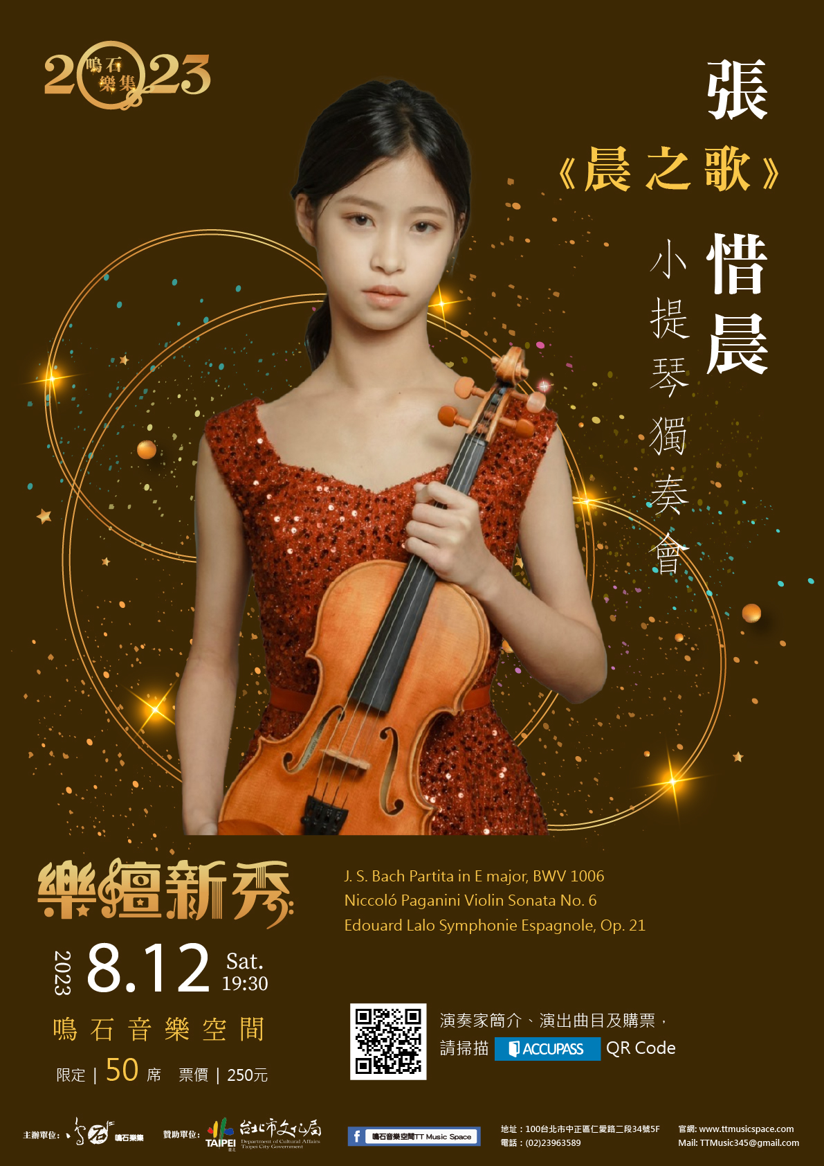 2023年榮獲第十五屆台灣絃樂團小提琴比賽少年組第一名,並於同年首度登上國家音樂廳由台灣絃樂團協奏,獨奏演出莫札特第三號小提琴協奏曲。同年並榮獲新加坡萊佛士國際音樂比賽The annual Singapore Raffles International Music Festival (SRIMF) 青少年組(Youth age13-16)第一名金獎。