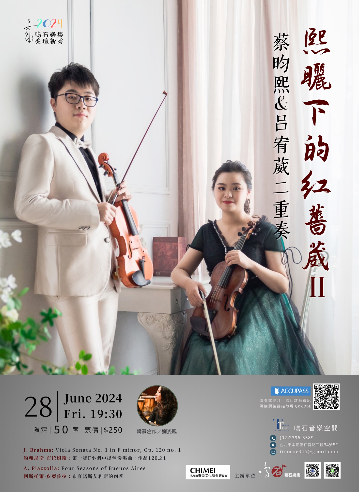 蔡昀熙與呂宥葳,兩位分別來自臺灣南北的翹楚,彼此透過古典音樂相遇,藉由熱愛古典音樂的心,長期耕耘小提琴、中提琴的演奏技巧以及音樂詮釋。這場音樂會將透過小提琴獨奏、小提琴與中提琴,以及雙小提琴的曲目,帶給聽眾弦樂之間交織纏綿的對話!