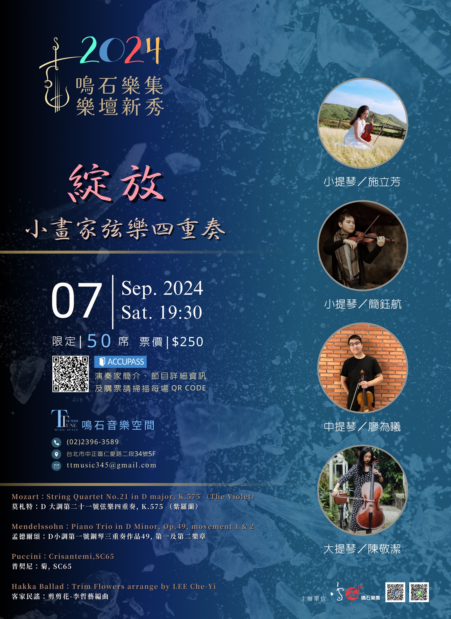 《綻放》音樂會由小畫家弦樂四重奏呈獻。曾在台灣多個知名場所演出,其中包括國立臺灣圖書館、蘭陽地景音樂廳、誠品松菸和益品書屋等。他們以優秀的演奏技巧和深厚的音樂底蘊贏得了廣泛好評。