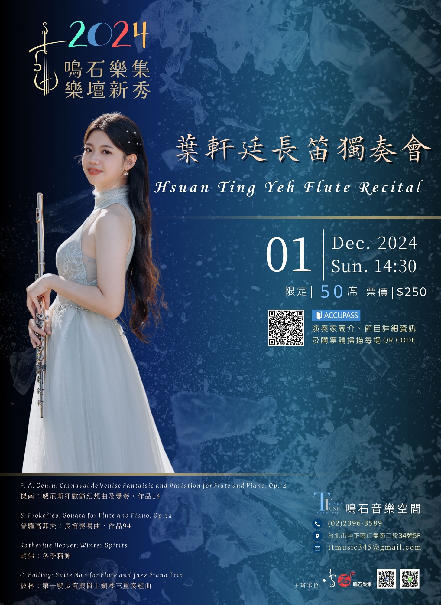 優美的木管樂器-長笛,從原始的木笛到現在金屬製的長笛皆保留了細膩而優美的聲音。這場音樂會將帶領大家從細膩的巴洛克時期作品到炫彩及華麗的浪漫時期及現代作品,最後以短笛和打擊樂的室內樂作品做收場。希望喜歡長笛作品的大家都會喜歡這次的演出曲目。